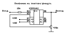 Приёмник представляет собой триггер Шмидта. С точки зрения "паяльника" это один ОУ практически любой марки и три резистора, два из которых задают уровень срабатывания. Принцип работы таков: Как тлько входной сигнал превысил положительный порог срабатывания, триггер переключается в 1, обратное переключение происходит, когда уровень сигнала будет меньше отрицательного порога срабатывания. Из этого следует, что помеха амплитудой меньше чем (2*порог срабатывания) не может помешать достоверному приёму. Таким образом приём информации осуществляется по 1 биту вводимому в COM порт.