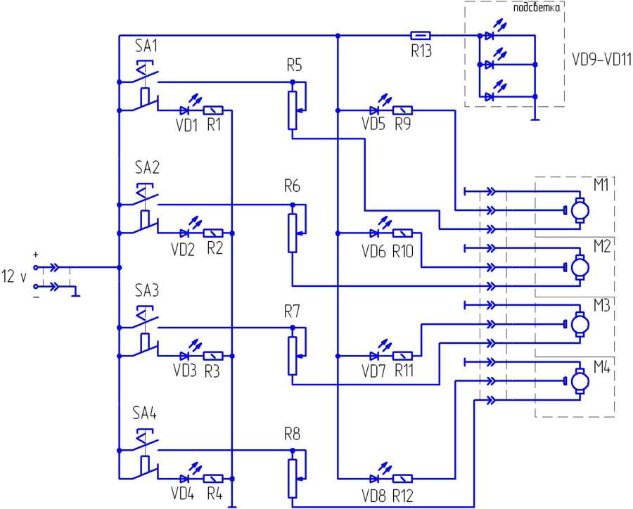 Собственно схема проста, дальше некуда. В выключенном состоянии SA1-SA4 горят красные светодиоды VD1-VD4. Во включенном через переменные резисторы R5-R8, плюс питания поступает на двигатель вентилятора и мерцает (зависит от частоты оборотов вентилятора) зеленые светодиоды VD5-VD8. Экспериментальным путем решено было взять переменные резисторы номиналом 470 Ом. Если взять больше или меньше, то область регулировки будет маленькой. Для подсветки ручек резисторов под фальш-панелью стоят 3 ультра-ярких синих светодиода VD9-VD11. Для расчета резисторов можно использовать эту статью.