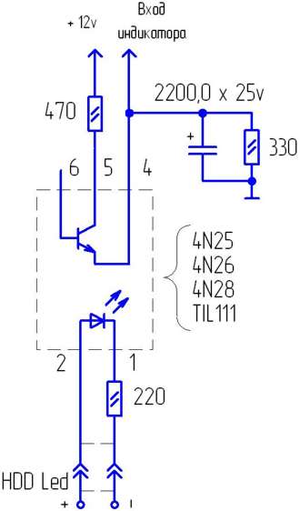 Для индикации линейной шкалой загрузки HDD, есть тоже много схем, обычно они на 10 светодиодах. Но покупать дорогую микросхему, мне не хотелось - просто я нашел у себя спаянную на пяти светодиодах и микросхеме AN6884 (KA2284B) см. схему слева. Описание работы этой схемы здесь. Единственное я ее немного доработал (см. схему слева). Для безопасной работы нужна гальваническая развязка по входу на оптроне и если хотите что бы светящийся столбик светодиодов не был бы сильно "живчиком", а медленно загорался и медленно тух, то нужно поставить RC-цепочку 2200,0 мкф х 25 В и 330 Ом. Емкость электролитического конденсатора подбирается опытным путем - кому какая нравится "заторможенность" индикатора. Схему можно подпаять к светодиоду "HDD Led" или подключить прямо к материнке. Если перепутаете питание на входе, ничего страшного, поменяйте полюсовку и все будет работать. Кстати резистор 220 Ом необязательно ставить, просто я перестраховался, но в итоге оказалось что он не нужен.