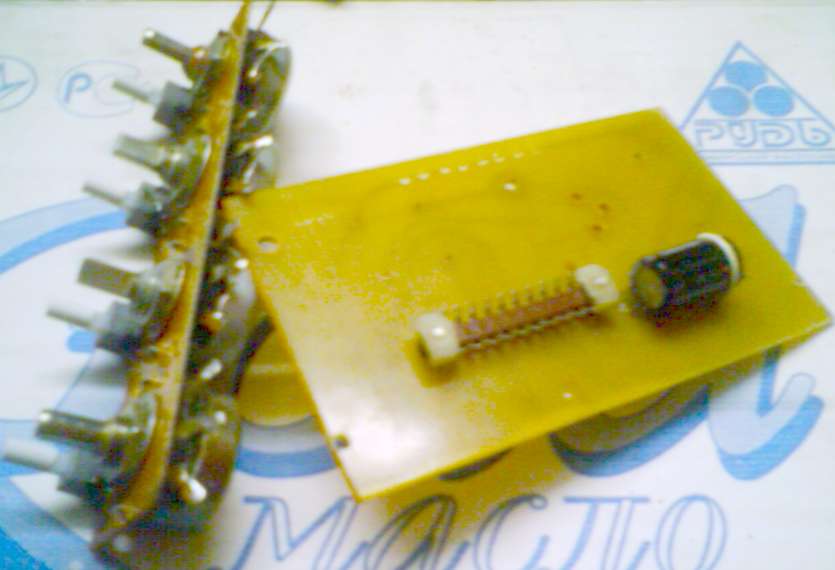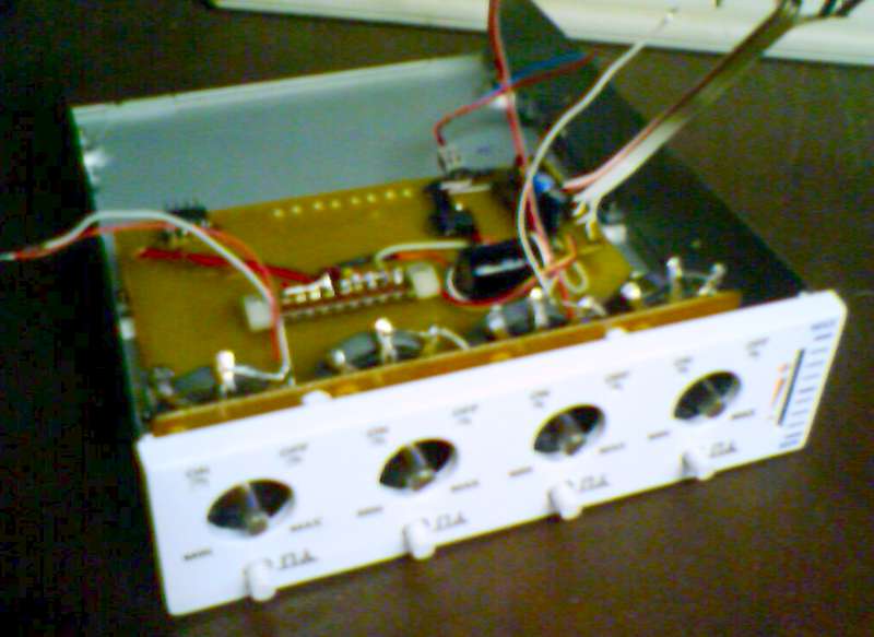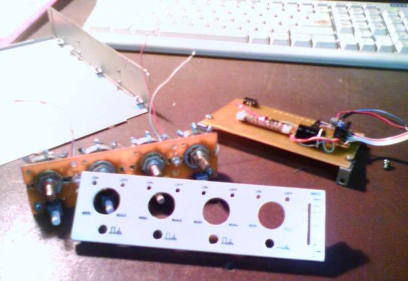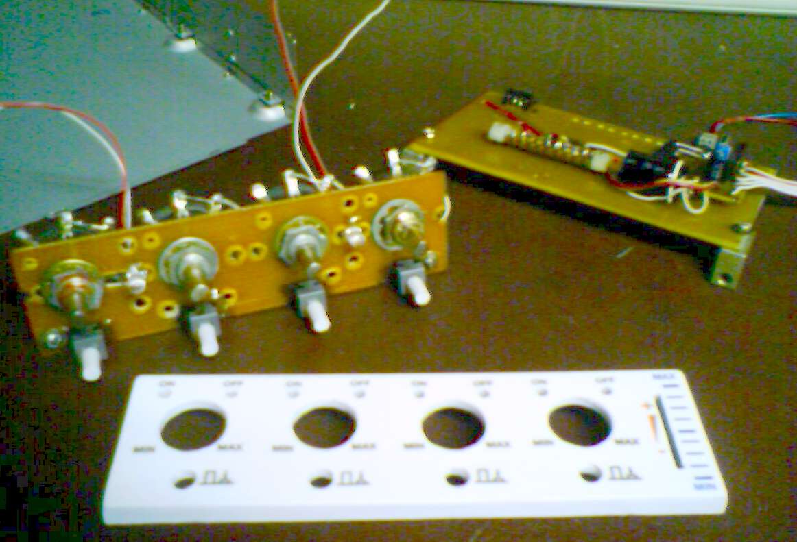 Как видно из фоток (сожалею что плохого качества, но цифровик на работу лень было тянуть, поэтому фоткал мобилкой), переднюю панель я взял от заглушки на 5,25" место в системном блоке компьютера. Ну у кого есть дремель, тому легче будет высверлить и выфрезеровать все отверстия под кнопочки, ручки переменных резисторов и светодиоды. Я это делал почти вручную. Плата с разъемом и электролитическим конденсатором будет служить монтажной кросс-платой где будет крепиться все основное.