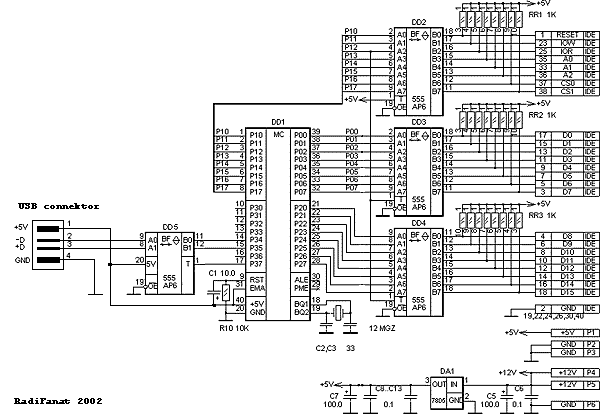 Многие сейчас проводя "апгрейд" своих персоналок, покупают новые многогигабайтные "винчестеры". А куда деть старые? Один из вариантов - использовать в качестве сменного носителя информации, для чего ставится 5-ти дюймовая "корзина", вроде бы все нормально. Но, как оказалось, не все здесь гладко. На компьютере, куда мы хотим перенести информацию, такой корзины может не оказаться, и тогда ... разбираем корпус, подключаем шлейф... в общем мороки достаточно. А выход простой - вот он! Многие старые и все новые персоналки сейчас имеют универсальный USB порт. Так вот и будем им пользоваться. Схема контроллера (puc.1) достаточно простая - микропроцессор и несколько микросхем. Все остальное выполнит программа. Применен процессор АТ89С51 (DD1) фирмы ATMEL. Связь процессора с дисководом осуществляется посредством 3-х шинных буферов выполненных на микросхемах 555АП6 (DD2-DD4). Структура IDE интерфейса достаточно подробно рассмотрена в [3], где рассматривается аналогичное устройство, но только для параллельного порта.