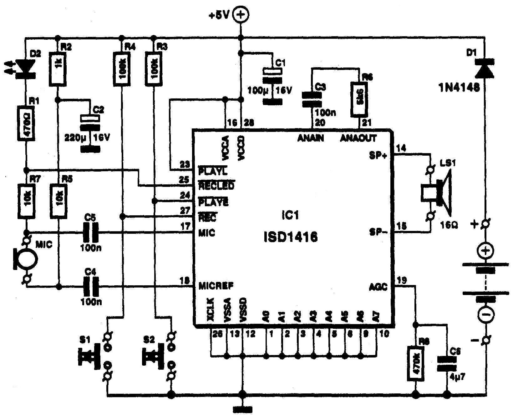 Устройство выполняет запись и воспроизведение звука от электретного микрофона MIC в течение 16 секунд. Он собран на ИМС IC1 ISD1416 Integrated Storage Device (подразделение Winbond, www.winbond.usa.com/ products/), которая содержит встроенный микрофонный предусилитель с АРУ, АЦП (частота дискретизации 8 кГц) и 128К энергонезависимой памяти, каждая ячейка которой способна запоминать 256 уровней (а не два, как в простой бинарной).