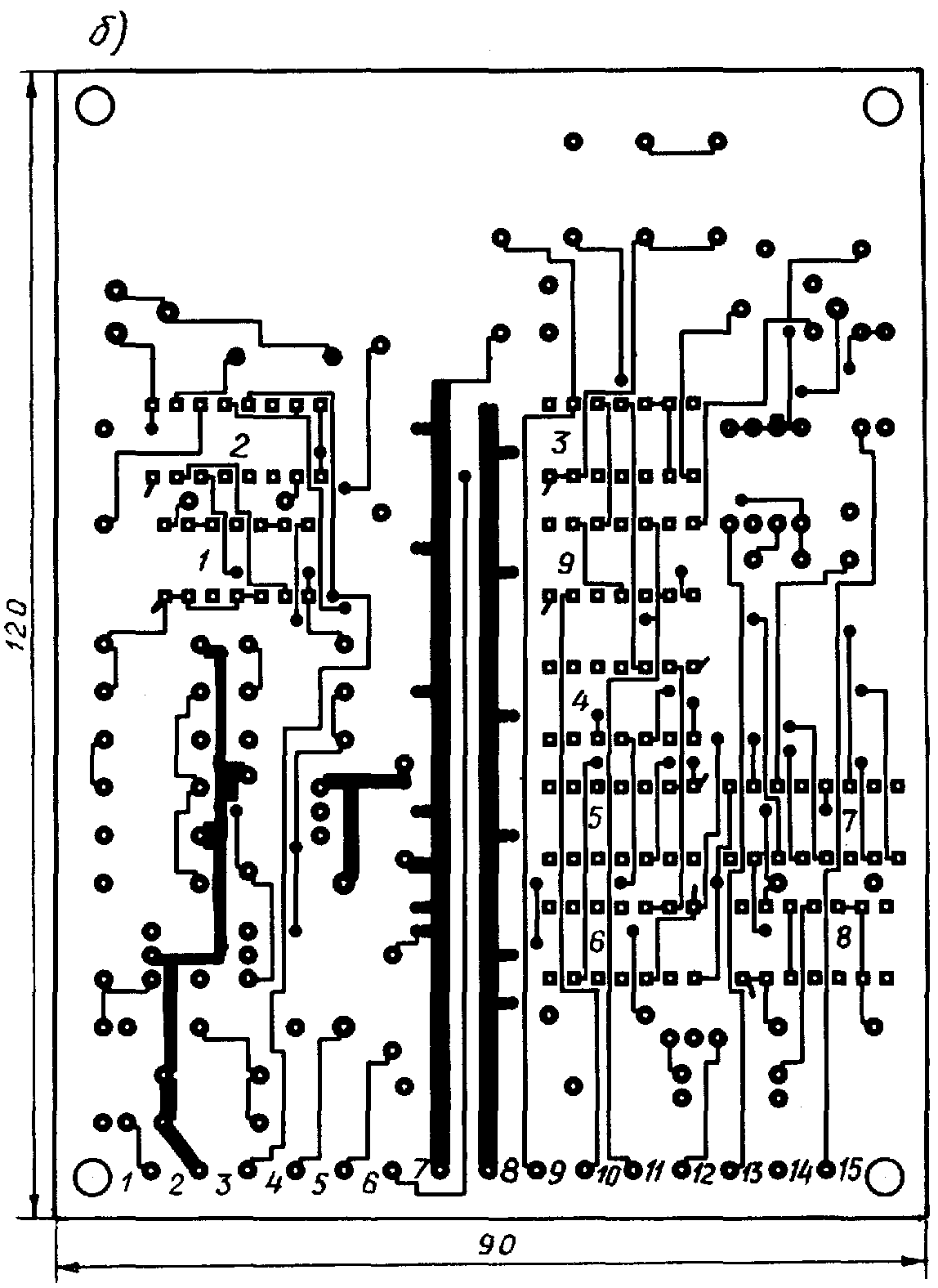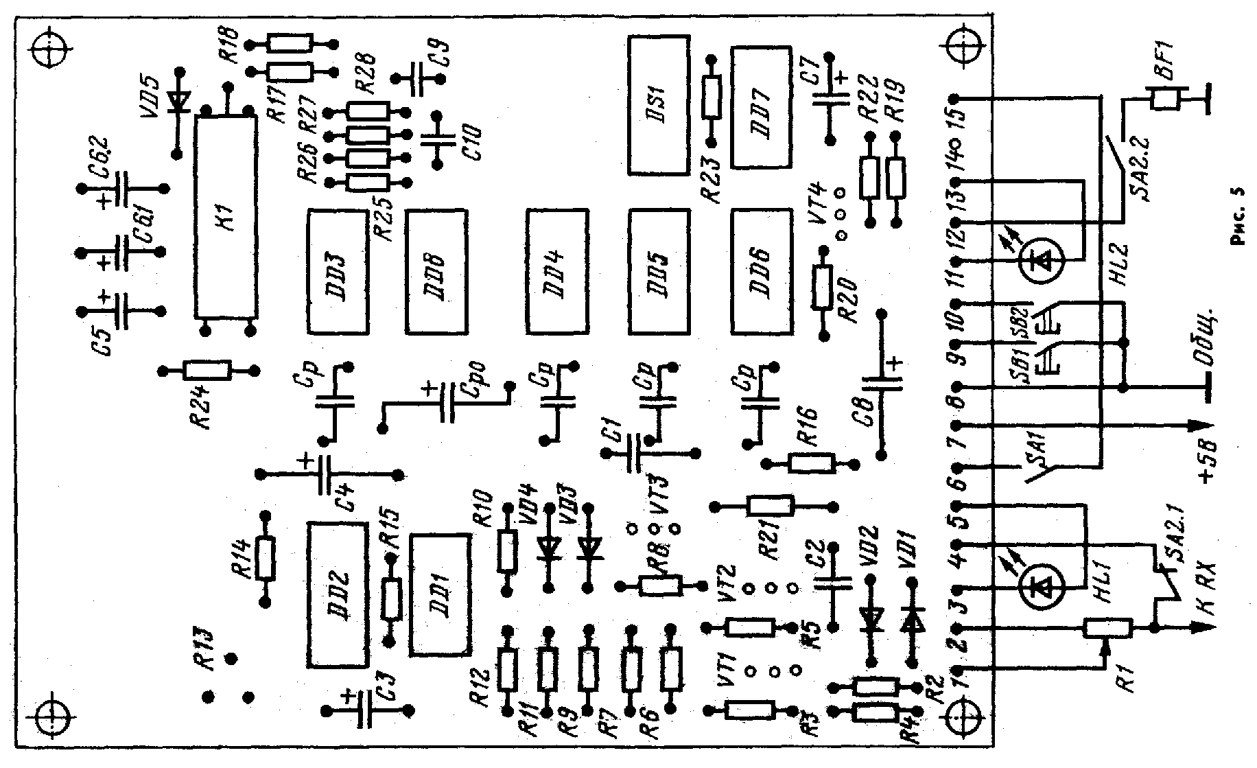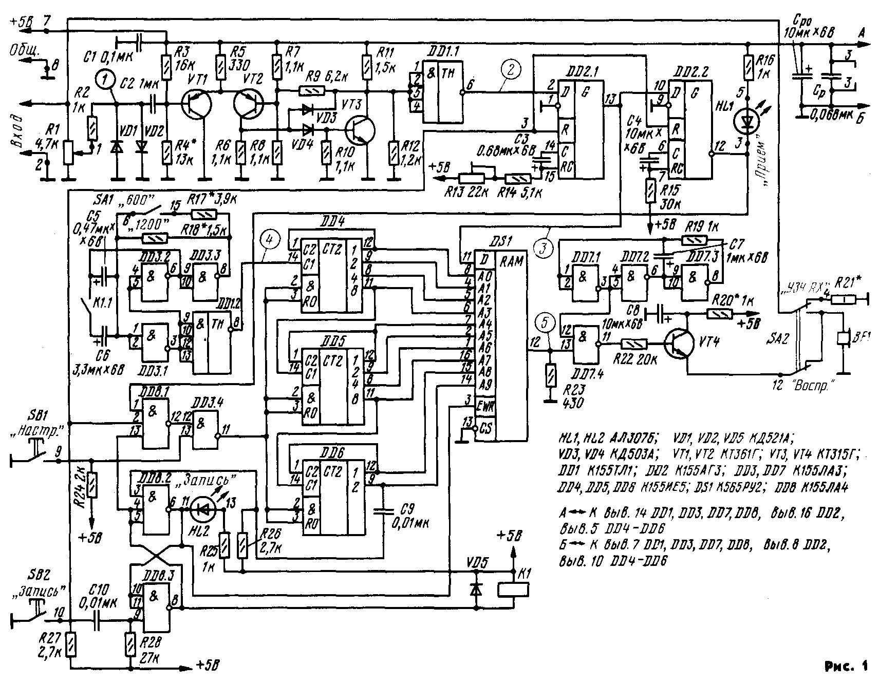 В заключение несколько практических советов. Если используемый приемник имеет регулятор усиления по ЗЧ, то в цифровом «магнитофоне» резистор R1 можно исключить, а входной сигнал подавать на резистор R2 (точка 1 на плате).