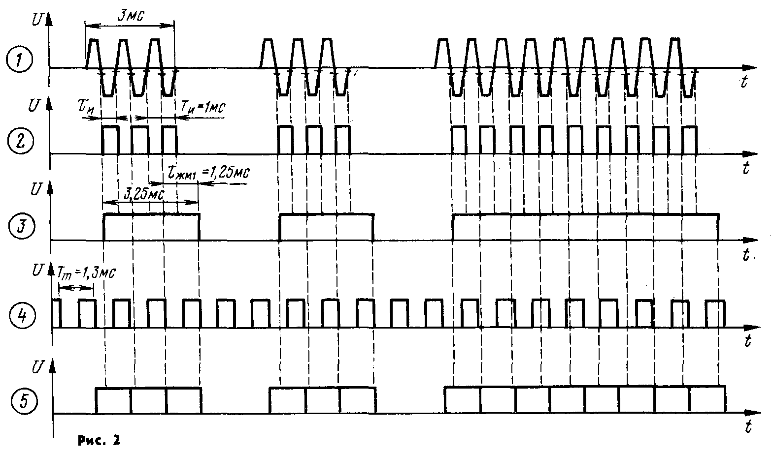 Принципиальная схема устройства изображена на рис. 1. Оно состоит из аналого-цифрового преобразователя на транзисторах VT1—VT3 и триггере Шмитта DD1.1, узла «восстановления» огибающей сигнала (выполнен на ждущем мультивибраторе DD2.1), управляемого тактового генератора на элементах 2И-НЕ микросхемы DD3, узлов памяти (на счетчиках DD4—DD6 и ОЗУ DS1) и управления (на ждущем мультивибраторе DD2.2 и микросхеме DD8) и тонального генератора на элементах 2И-НЕ DD7.1 — DD7.3. Эпюры напряжения в некоторых точках устройства показаны на рис. 2.