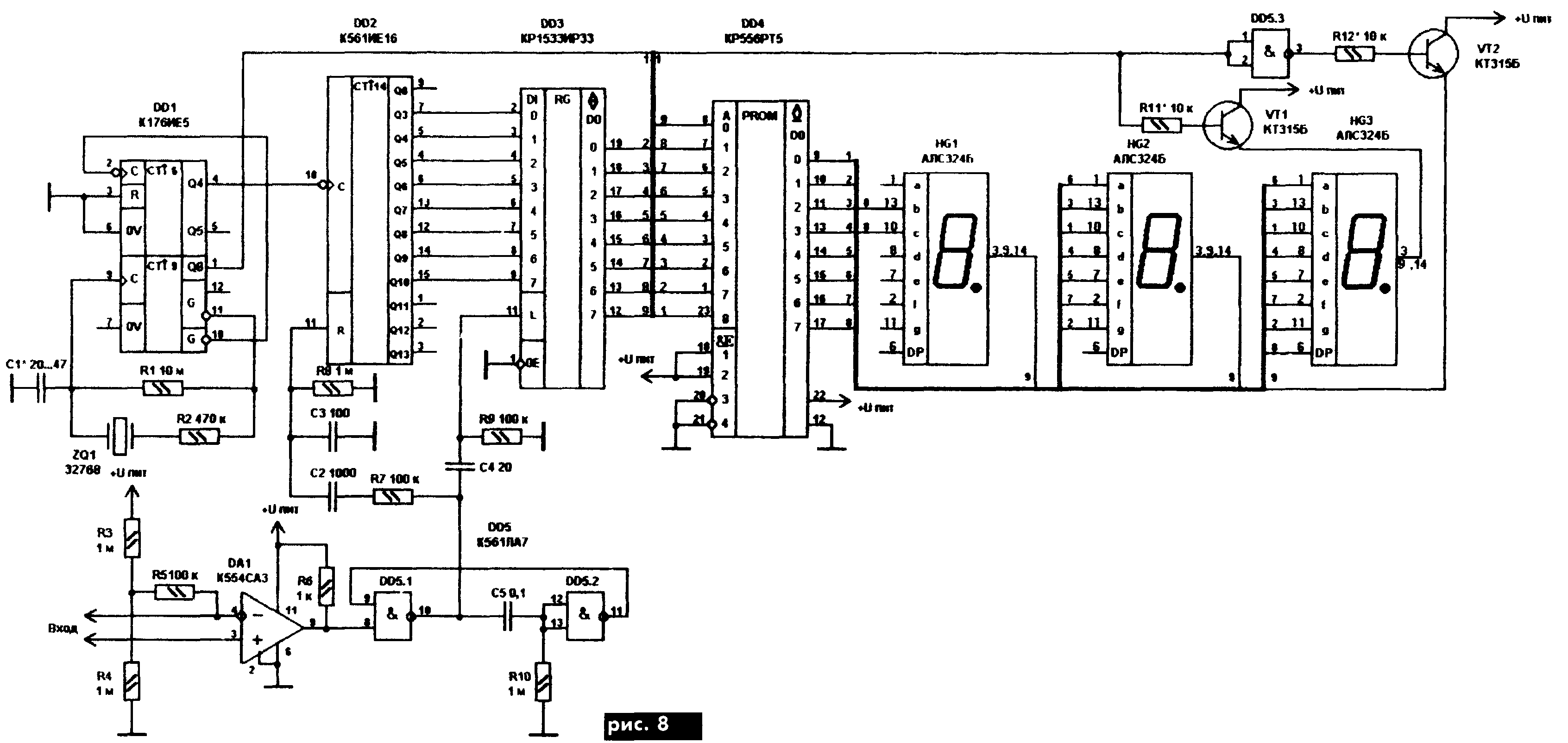 В статье А Колдуново "Цифровой измеритель пульса" (Радиолюбитель, 4/2001, с 6) приведена схема измерителя частоты пульса (ЧП), который используется, когда необходим оперативный контроль ЧП, например, при занятиях спортом Для упрощения схемы применяют цифровой способ, при котором на ИМС ПЗУ можно "записать" всю таблицу соответствия "число импульсов - частота пульса". Схема такого измерителя ЧП приведена на рис.8. Входной каскад выполнен на компараторе DA1, поэтому он имеет довольно высокую чувствительность Схема рассчитана на работу совместно с электродинамическим или пьезоэлектрическим датчиком (в последнем случае параллельно датчику следует подключить резистор сопротивлением на 10 100 Ом). Микросхема DD4 подключена к питанию несколько необычно только через вход программирования (выв 22) В таком режиме работоспособность большинства микросхем полностью сохраняется, при этом несколько уменьшается потребляемый ток (62 мА против 93 мА) При питании от батарей (4,5 В) экономится 30 мА.
