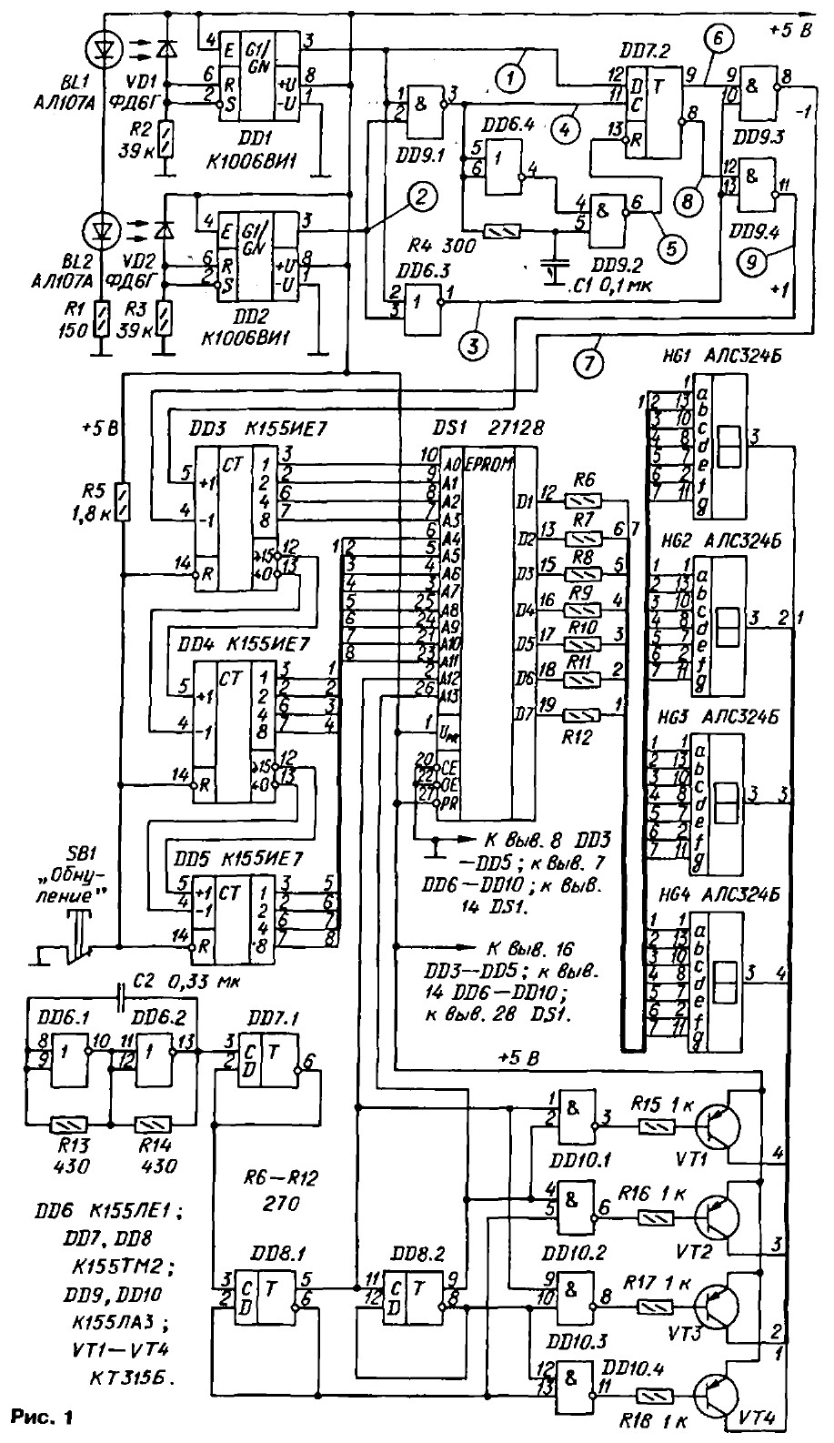Принципиальная схема прибора представлена на рис. 1. В состав устройства входят реверсивный двенадцатиразрядный двоичный счетчик DD3— DD5, постоянное запоминающее устройство DS1, выполняющее функции мультиплексора, дешифратора состояния счетчиков, преобразователя двоичного кода в двоично-десятичный позиционный код для динамического управления индикатором с гашением незначащих нулей, селектор импульсов DD9, DD6.3, DD6.4, DD7.2, управляемый двумя оптоэлектронными инфракрасными датчиками BL1VD1. DD1 и BL2VD2, DD2, тактирующий генератор DD6.1, DD6.2 с делителем частоты на триггере DD7.1, счетчик импульсов DD8, четырехфазный дешифратор DD10, выходы которого нагружены усилителями тока VT1—VT4, коммутирующими светодиодные индикаторы HG1—HG4. В зависимости от состояния триггеров DD8.1, DD8.2 по входам А12 и А13 запоминающего устройства DS1 выбирается одна из его четырех областей памяти. Для индикации цифр в устройство записывают шестнадцатиричные числа согласно табл. 1. Знак X в ней обозначает гашение индикатора. Подробно этот принцип использования запоминающего устройства рассмотрен в [1]. Поскольку индикатор четырехразрядный, весь объем памяти разделен на четыре области, в которых записана соответствующая информация (табл. 2). Начиная с адреса 0000 заносят числа ряда 0, 1, 2.....8, 9, 0; 1, 2,... и т.д. до адреса OFFF, по которому должно записаться число 49, соответствующее цифре 5. Информация повторяется блоками 0000—004F, 0050— 009F, 00A0-00EF. С адреса 1000 заносят по 10 раз числа рядаХ,1,2,...,8,9,0;1,2,...ит. д. до адреса 1FFF, по которому должно записаться число 09 (цифра 9). Информация повторяется блоками 1000—118F, 1190—131F, 1320— 14AF. С адреса 2000 — по 100 раз числа ряда Х.1,2,...8,9,0,1,2,... и т. д. до 2FFF, по которому должно записаться число 03 (цифра 0). Информация повторяется блоками 2000 - 27CF, 27D0 - 2F9R 2FA0 - 2FFF. И наконец, с адреса 3000 — по 1000 раз числа ряда X, 1, 2,3, 4 до адреса 3FFF, по которому должно записаться число 99 (цифра 4). Информация повторяется блоками 3000—ЗЗЕ7, ЗЗЕ8—37CF, 37D0-3BB7, 3BB8-3F9F, 3FA0—3FFF. Содержимое памяти представлено фрагментами в табл. 3. Присутствие в начале каждой области (кроме первой) числа FF как раз и позволяет дешифратору выполнять функцию гашения незначащих нулей индикатора.