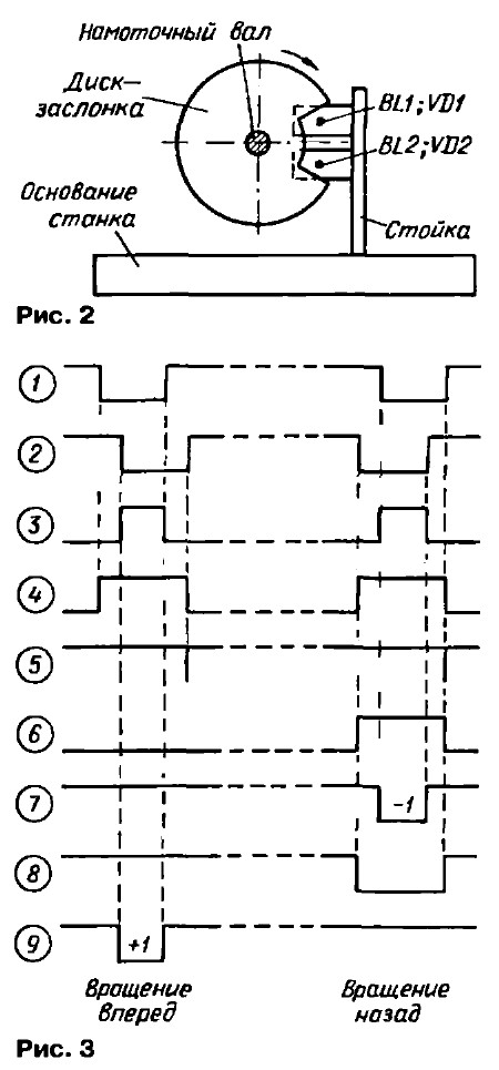 Датчик направления вращения вала намоточного станка, работающий совместно с селектором импульсов, представляет собой две оптопары BL1VD1, BL2VD2 и посаженный на вал диск—заслонку с секторным вырезом (рис. 2). Вращающийся диск—заслонка большую часть оборота перекрывает поток инфракрасных лучей от диодного излучателя (BL1, BL2) оптопары к своему фотодиоду (VD1, VD2). Угловая ширина выреза и размещение оптопар должны быть такими, чтобы при вращении диска в течение некоторого времени одновременно оба фотодиода были бы "засвечены" каждый своим излучателем (на рис. 2 условно снят один из компонентов каждой оптопары; стрелкой показано направление вращения вперед). Импульсы с фотоприемников VD1, VD2 поступают на входы триггеров Шмитта DD1, DD2. На элементах DD6.4. DD9.2 и цепи R4C1 собран формирователь коротких импульсов, обнуляющих триггер DD7.2 в конце каждого цикла работы селектора.
