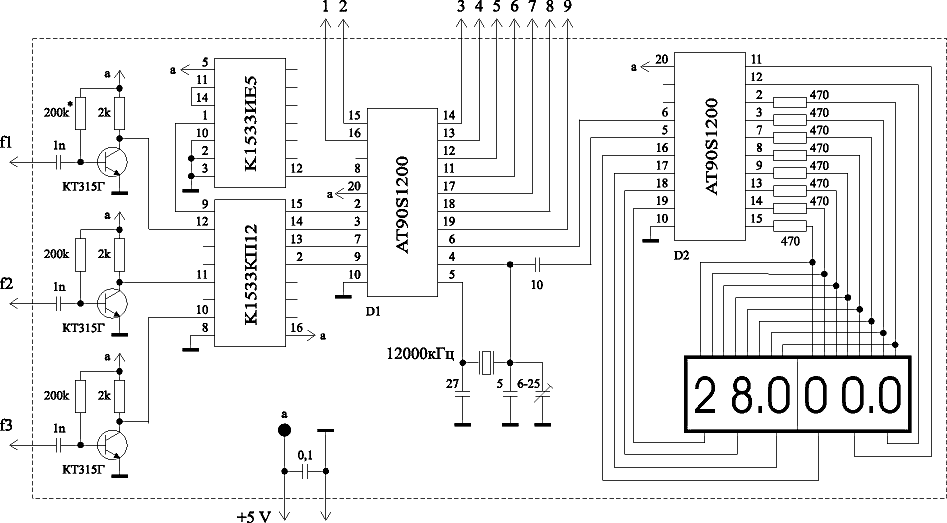 При одновходовом режиме измеряемый сигнал подается на вход f1. Базы буферных транзисторов на входах f2 и f3 желательно замкнуть на общий провод. Для работы устройства в качестве частотомера записывается ПЧ = 000000, и выбирается одновходовой режим. Для обеспечения максимальной чувствительности под определенный уровень входного сигнала подбираются базовые резисторы транзисторов входных буферных каскадов.