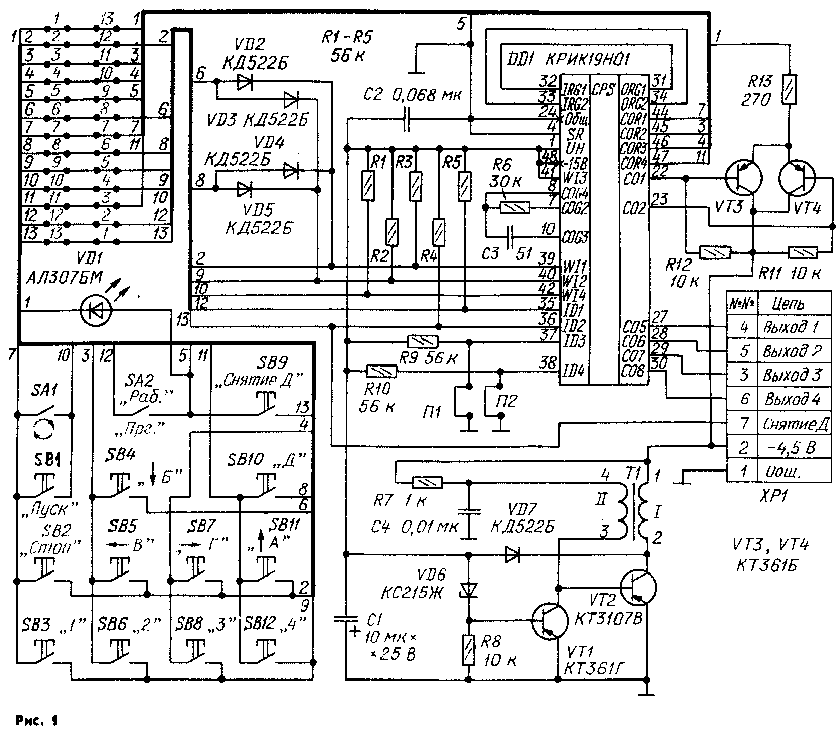 Преобразователь напряжения собран на транзисторах VT1, VT2 и трансформаторе Т1. Собственно микроконтроллер выполнен в виде однокристальной микро-ЭВМ последовательного действия, у которой математическое обеспечение ориентировано на решение задач управления. Эти задачи он решает путем выполнения вычислительных операций над исходной информацией и организации программных счетчиков и ветвлений по результатам ее обработки по программе, введенной в постоянное запоминающее устройство (ПЗУ) контроллера при его изготовлении. Кроме того, оперативное запоминающее устройство (ОЗУ) контроллера запоминает введенные команды, формирует временные интервалы, подает на выход сигналы управления. Для установки того или иного режима работы микросхемы в устройстве предусмотрены внешние радиоэлементы. Времяза-дающая цепь, состоящая из резистора R6 и конденсатора СЗ, определяет частоту фазогенера-тора контроллера. Режим работы микросхемы и длительность интервала выходных сигналов устанавливают выбором номиналов резисторов R3—R5, R9, R10 и установкой перемычек П1 и П2 согласно табл. 1. С выходов COR1—COR4 микросхемы на клавиатуру поступают сигналы четырех фаз. В зависимости от нажатой клавиши и положения переключателей SA1 и SA2 на входы W11, W12, W14, ID1, ID2 поступает сигнал соответствующей фазы, задавая таким образом команду для контроллера.