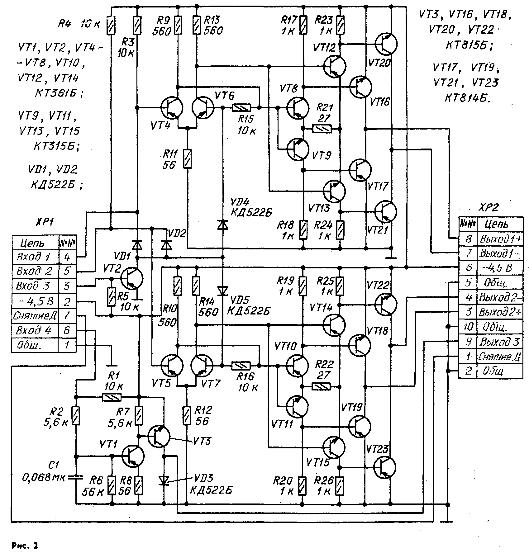 Первый вариант блока усилителей (его схема показана на рис. 2) предусматривает возможность управления двумя реверсивными электродвигателями (с изменением направления вращения ротора) и исполнительным устройством (электродвигатель, электромагнит и т. п.), приводимым в действие по команде Д, с током нагрузки до 450 мА каждый. Для управления электродвигателями предназначены два идентичных усилителя (VT4, VT6, VT8, VT9, VT12, VT13, VT16, VT17, VT20, VT21 и VT5, VT7, VT10, VT11, VT14, VT15, VT18, VT19, VT22, VT23). Усилители собраны по традиционной мостовой схеме. Нагрузку (электродвигатели) подключают к диагонали моста из транзисторов (VT16, VT17, VT20, VT21 и VT18, VT19, VT22, VT23). Узел на транзисторе VT2 блокирует входы усилителей при поступлении на вход команд Стоп или Д, что соответствует уровню 1 на выходе СО7 контроллера. В этот момент транзистор VT2 открывается и подключает базу транзисторов VT4—VT7 к общему проводу через диоды VD1, VD2, VD4, VD5, закрывая оба мостовых усилителя. Третий усилитель блока собран на транзисторах VT1, VT3. При команде Д отрицательное напряжение (4,5 В) на Входе 4 ХР1 открывает транзистор VT1, а вслед за ним и VT3. Открывшийся транзистор VT3 подключает питание к нагрузке, подключенной к Выходу 3 ХР2. Диод VD3 защищает транзистор VT3 от пробоя всплесками напряжения, которые могут появиться при индуктивной нагрузке усилителя (реле, электромагнит, электродвигатель).