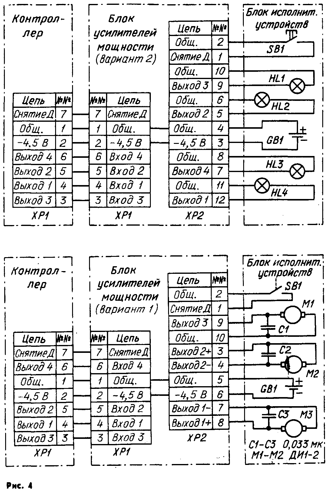 Функциональная схема комплекса в обоих вариантах показана на рис. 4. Плату блока усилителей соединяют с контроллером и исполнительным устройством жгутом проводников. Проводники припаивают к специальным штырям, впаиваемым в отверстия на краях плат. Комплект штырей для этой цели имеется в наборе. Можно впаивать концы проводников и непосредственно в отверстия платы. В исполнительном устройстве варианта 1 можно использовать электродвигатели ДИ1-2, широко применяемые в моделизме. Микропереключатель SB1 может быть установлен так, что перемещающееся звено механизма в крайнем положении будет замыкать контакты, снимая команду Д и останавливая тем самым электродвигатель M1. Параллельно этому переключателю можно установить еще один для фиксации второго крайнего положения звена. Не исключено и ручное снятие команды Д.