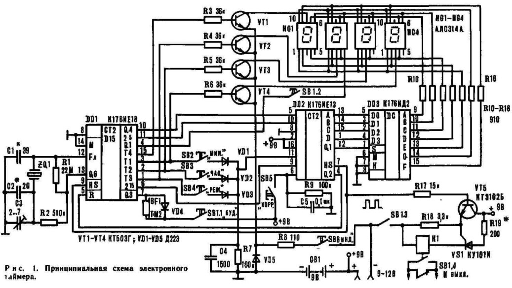 Многие владельцы бытовой радиоаппаратуры — радиоприемников, магнитофонов, магнитол — могут расширить функциональные возможности своих аппаратов, оснастив их электронным таймером. Это устройство показывает текущее время и позволяет включать или выключать радиоаппаратуру в заранее установленный момент. Кроме того, оно может служить будильником, поможет записать в отсутствие владельца интересную радиопрограмму, известит своим сигналом о начале нужной телепередачи и т. д. Работает прибор от внутреннего источника питания радиоаппарата (9—12 В). Точность хода таймера стабилизирована кварцевым резонатором и составляет ±1 с в сутки. Таймер собран на микросхемах повышенной степени интеграции и энергоэкономичности. При отключенной индикации устройство потребляет всего доли микроватта, в ждущем режиме расходуемый им ток не превышает 0,3 мА. Блок индикации, выполненный на миниатюрных светодиодных индикаторах, может быть встроен в любое удобное место радиоаппаратуры. Таймер собран на трех специализированных микросхемах (см. рис. 1): генератор DD1— К176ИЕ18, счетчик DD2—K176ME13, дешифратор DD3—К176ИД2. Интегральная микросхема К176ИЕ18 специально разработана для использования в электронных часах. В ее состав входит генератор, рассчитанный на работу с внешним кварцевым резонатором частотой 32 768 Гц, и два делителя частоты с коэффициентами деления 215 =32768 и 60. Сопротивление резистора R1 может находиться в пределах 10—33МОм. Конденсатор СЗ служит для точной подстройки частоты. На выходах Т1—Т4 DD1 формируются импульсы с частотой 128 Гц и скважностью 4, сдвинутые между собой на четверть периода. Они необходимы для коммутации разрядов индикатора в часах при динамической индикации. Сигнал с частотой 1 Гц с вывода 4 микросхемы можно использовать для зажигания разделительной точки. В данном устройстве он сигнализирует о работе часов в режиме «будильник-таймер». ИМС К176ИЕ18 имеет специальный формирователь звукового сигнала. При подаче на вход HS импульса положительной полярности с одноименного выхода микросхемы DD2 на выводе 7 DD1 появляются пачки отрицательных импульсов с частотой заполнения 2048 Гц и скважностью 2. Длительность пачек — 0,5 с, период заполнения — 1с. Выход Q3 (вывод 7) выполнен с «открытым» стоком и позволяет подключать излучатели сопротивлением более 50 Ом без эмиттерных повторителей. Микросхема DD2 содержит счетчики минут и часов, регистр памяти будильника, цепи сравнения и включения звукового сигнала, цепи формирования сигналов цифр в двоичном коде при динамической индикации. При уровне 1 на выходе Т1 DD1, на выходах А—В—С—D DD2 присутствуют сигналы, соответствующие в двоичном коде цифре единиц минут: при таком же уровне на выходе Т2 — сигналы десятков минут и т. д. На выходе Q1 (вывод 12) формируются импульсы для записи сигналов цифр в триггеры памяти микросхемы DD3. С выхода HS (вывод 7 DD2) снимается сигнал будильника, используемый для запуска выходного реле К1, коммутирующего выключатель питания в режиме таймера. Реле включено в катодную цепь тринистора VS1, управляющий вход которого подключен через согласующий повторитель на транзисторе VT5 к выводу 7 DD2. Напряжение питания 9 В на все три микросхемы подается на вывод 16, а с общим проводом соединяют вывод 8. При подаче питания счетчики часов и минут, а также регистр памяти автоматически переводятся в нулево