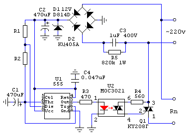 Работает устройство следующим образом. При подаче питания на микросхему U1 начинает заряжаться конденсатор C1, в результате на выводе 3 U1 появляется напряжение, близкое к напряжению питания. По окончании зарядки конденсатора C1 внутри микросхемы U1 открываться транзистор, соединяющий ее седьмой и первый выводы, вследствии чего конденсатор С1 разряжается через резистор R2. После этого цикл работы прибора повторяется. |