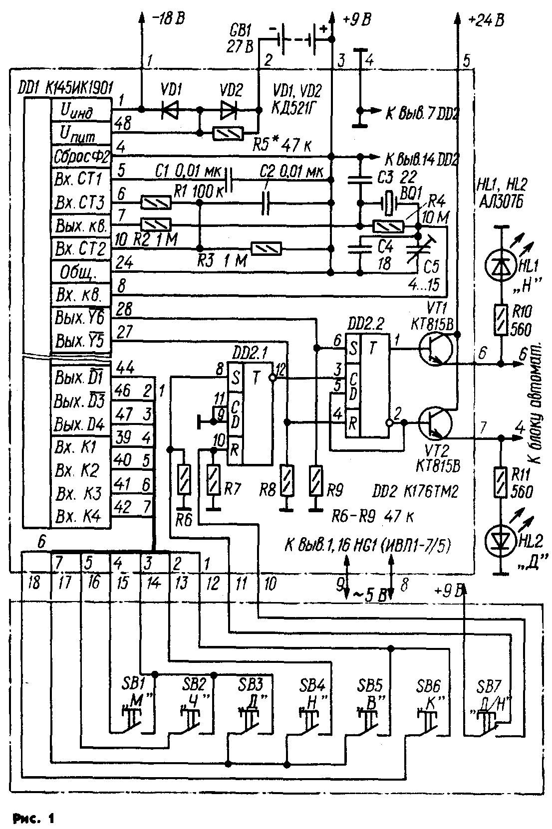 В положении кнопки SВ7, показанном на схеме, RS-триггер DD2.1 находится в единичном состоянии, когда на его инверсном выходе (вывод 12) напряжение низкого логического уровня. При каждом нажатии на кнопку на этом выходе появляется сигнал высокого уровня и триггер DD2.2 переключается то в единичное (напряжение высокого уровня на прямом выходе), то в нулевое состояние (такое же напряжение на инверсном выходе). В результате открывается транзистор VТ1 или VТ2, и возникающее на его эмиттере напряжение положительной полярности поступает на вход соответствующего канала блока автоматики. Состояния триггера индицируют светодиоды НL1 и НL2. Автоматическая смена «дня» и «ночи» происходит под действием сигналов, снимаемых с выводов 27 и 28 микросхемы DD1. Питание микросхемы DD1 необычно: требуемое напряжение 27 В получено от соединенных встречно-последовательно источников напряжением +9 и —18 В (по отношению к общему проводу). Через диод VD1 вывод питания 48 соединен с выводом 1, а через VD2 — с резервным источником питания — аккумуляторной батареей GВ1, что позволяет сохранить отсчет текущего времени при пропадании напряжения в сети. Ток, протекающий через резистор R5, компенсирует ток саморазрядки батареи [Л].