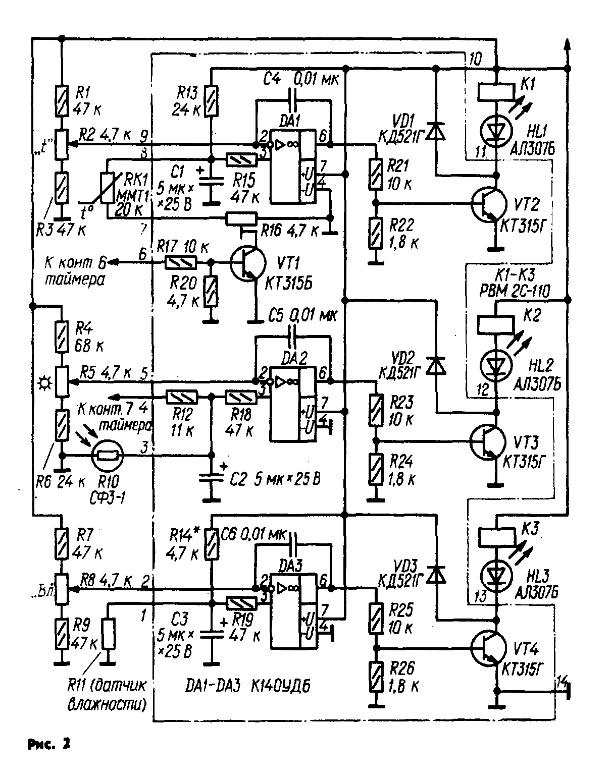 Принципиальная схема блока автоматики показана на рис. 2. Он содержит каналы регулирования освещенности, температуры воздуха и влажности почвы. Каждый из каналов включает в себя измерительный мост с датчиком регулируемого параметра, компаратор на основе ОУ и транзисторный усилитель тока, нагруженный электромагнитным реле и включенным последовательно с его обмоткой светодиодом — индикатором состояния канала. Неинвертирующие входы ОУ подключены к ветвям мостов, содержащим датчики, инвертирующие — к ветвям, представляющим собой регулируемые делители напряжения питания (оно поэтому должно быть стабилизированным). Если значение регулируемого параметра ниже заданного, напряжение на неинвертирующем входе ОУ больше, чем на инвертирующем и выходное напряжение компаратора близко к +24 В, а если, наоборот, выше,— к нулю. В первом случае транзистор усилителя тока открыт, реле включено и цепь питания исполнительного устройства замкнута, во втором — транзистор закрыт и исполнительное устройство выключено. Диоды, шунтирующие обмотку реле, защищают транзисторы от всплесков напряжения самоиндукции, возникающих в моменты закрывания транзисторов. Канал регулирования температуры воздуха выполнен на ОУ DА1 и транзисторах VТ1, VТ2. Измерительный мост образован резисторами R1 — RЗ (они установлены на пульте управления), R13, R16 и терморезистором RК1. Требуемую температуру устанавливают переменным резистором R2. Чем ближе его движок к нижнему (по схеме) выводу, тем выше значение температуры, при которой переключается компаратор на ОУ DА1. В режиме «ночь» с выхода таймера (с эмиттера транзистора VТ1) через делитель R17R20 на базу транзистора VТ1 блока автоматики поступает напряжение высокого уровня, поэтому он открыт и шунтирует часть подстроечного резистора R16, включенную между движком и общим проводом. Вследствие этого компаратор изменяет свое состояние при более низкой температуре, чем «днем». Чем ближе движок резистора R16 к левому (по схеме) выводу, тем больше разница между «дневной» и «ночной» температурами.
