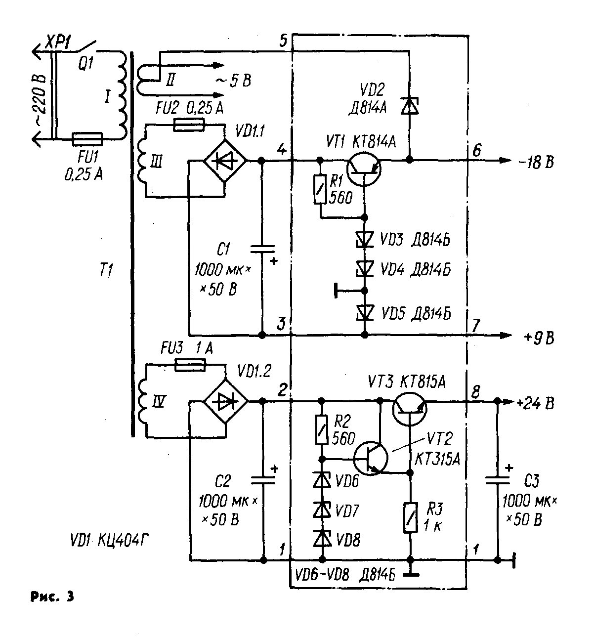 Источник питания устройства (рис. 3) особенностей не имеет. Он состоит из понижающего трансформатора Т1, двух выпрямителей (VD1.1, VD1.2) и такого же числа стабилизаторов напряжения (VDЗ—VD5, VТ1 и VD6—VD8, VТ2, VТЗ).