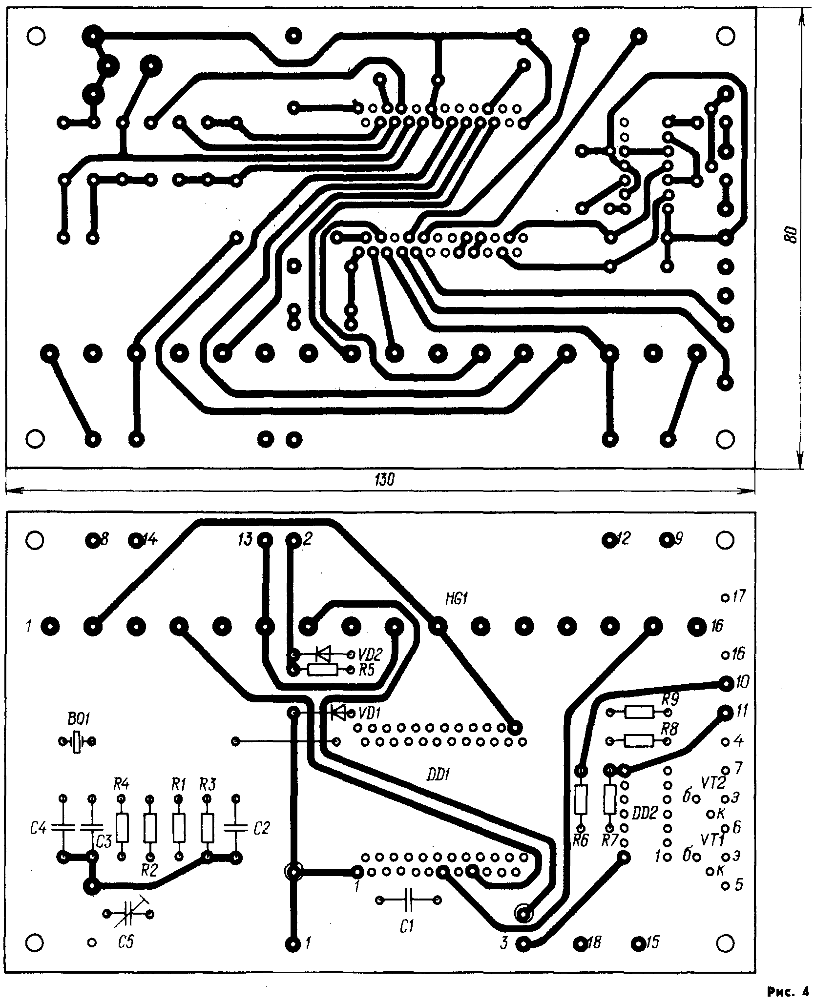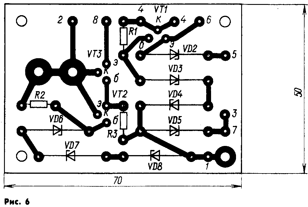 Большинство деталей автомата смонтировано на четырех печатных платах из фольгированного стеклотекстолита толщиной 1,5 мм. На одной из них (рис. 4) смонтирован таймер, на другой (рис. 5) — блок автоматики, на третьей (рис. 6) — источник питания, на четвертой (ее «рисунок» очень прост, поэтому чертеж не приводится) — кнопки управления таймером. В качестве последних можно использовать переключатели П2К без фиксации в нажатом положении, микропереключатели МП1 -1, МПЗ-1 и т. п., кнопки КМ 1-1.