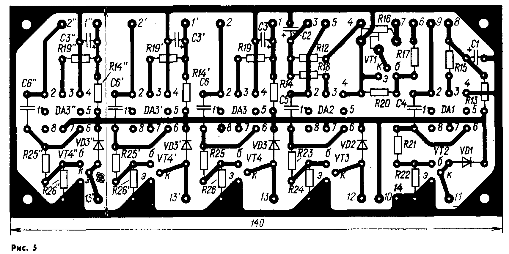 Налаживание устройства сводится к установке требуемых значений параметров переменными резисторами R2, R5 и R8. Не исключено, однако, что во время налаживания или эксплуатации реле какого-либо канала будет срабатывать нечетко. В этом случае канал необходимо охватить положительной ОС, включив, например, между инвертирующим входом ОУ и коллектором транзистора-усилителя тока резистор сопротивлением 1...10 МОм (его можно установить со стороны печатных проводников). Следует учесть, что с увеличением сопротивления этого резистора точность поддержания регулируемого параметра возрастает. Для расширения пределов регулирования параметров достаточно установить переменные резисторы R2, R5, R8 и подстроечный резистор R16 большего сопротивления.