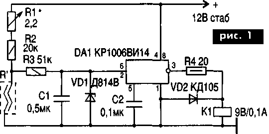 Резистор R2 ограничивает предел регулировки R1 до "нуля", R3 ограничивает ток на входе схемы от датчика при монтаже, аварийных ситуациях. Конденсатор С1 (с хорошей изоляцией!) сглаживает входной сигнал, а также наводки от сети. Стабилитрон VD1 желательно всегда применять в схемах с таймером КР1006ВИ1 - это позволит безопасно монтировать и налаживать устройство: стабилитрон ограничивает напряжение на входах таймера от + напряжения стабилизации до - 0,6 В. Стабилитрон выдерживает ток до 30 мА, а входной резистор имеет сопротивление 50 кОм. Вывод: входное напряжение до 1500 В не принесет вреда таймеру (а входной резистор выйдет из строя). Конденсатор С2 сглаживает потенциал вывода 5 микросхемы, который "задействован" в схемах сравнения компараторов, поэтому применение его обязательно. Диод VD2, включенный "обратно" питанию, убирает выбросы тока в момент выключения обмотки реле. Питание схемы должно быть стабилизированным (микросхема может нормально работать в интервале 5-16В питания [З].
