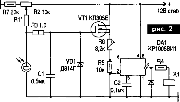 Фотореле (рис.2) содержит входной каскад на полевом транзисторе с изолированным затвором. Это повышает входное сопротивление до миллиардов ом и позволяет включать на вход схемы не только полупроводниковые фоторезисторы, но и вакуумные фотоэлементы, стабильность параметров которых при изменении температуры выше, чем у полупроводниковых. Разумеется, снизив сопротивление резистора R1 даже до 10 кОм, можно настроить вход схемы на сопротивление фотодатчико в момент срабатывания выходного реле. Схема с повторителем напряжения на полевом транзисторе позволяет регулировкой сопротивления резистора R6 "сближать" края интервала включения (выключения) реле.