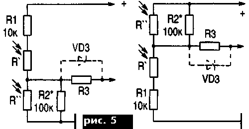Еще одно интересное применение может получить релейное устройство, если вход его оборудовать двойным (дифференциальным) датчиком освещенности или температуры. В этом случае выходное реле срабатывает при переходе границы свет/тень через двойной датчик. Для устранения ложных срабатываний, а также для защиты от большой засветки двух датчиков необходимо установить два резистора R1 - для ограничения тока "своего" фотодатчико и R2 -для добавки "начального" тока в плечо "своего" фотодатчика. Такая схема в случае засветки двух датчиков ярким светом дает на вход релейной схемы потенциал, близкий к предельным значениям R2 и R". Такой же потенциал подается на релейную схему в затемненном состоянии двух датчиков, когда высокое сопротивление фоторезисторов и их неравные "тепловые" токи могли бы привести к неопределенному сигналу на входе схемы. И только в случае не слишком большой засветки фотодатчиков, при условии большей освещенности R', релейное устройство переключается в необходимое состояние (смотря, кокой вариант входа на рис.5 нас устраивает). Такое необычное соединение датчиков позволяет легко выполнить мишень фототира. В центральной зоне - один фоторезистор, о вокруг него четыре, соединенные в параллель, только "попадание" света в центральную зону вызовет срабатывание выходного реле! Если резистор R3 зашунтировать кремниевым диодом, то в зависимости от его полярности, схема будет быстрее переходить в одно состояние и медленнее в другое. Подбором R3 и С1 можно задержать срабатывание реле от короткой вспышки света на некоторое время. Не составит труда изготовить будильник для рыболова, срабатывающий от света Луны. Для этого необходимо защитный тубус фотодатчиков навести на место, в котором появится Луна в определенное время ночи, так чтобы один датчике был освещен раньше, а другой позже. Если ночь будет безлунной или облачной, "будильник" не сработает!