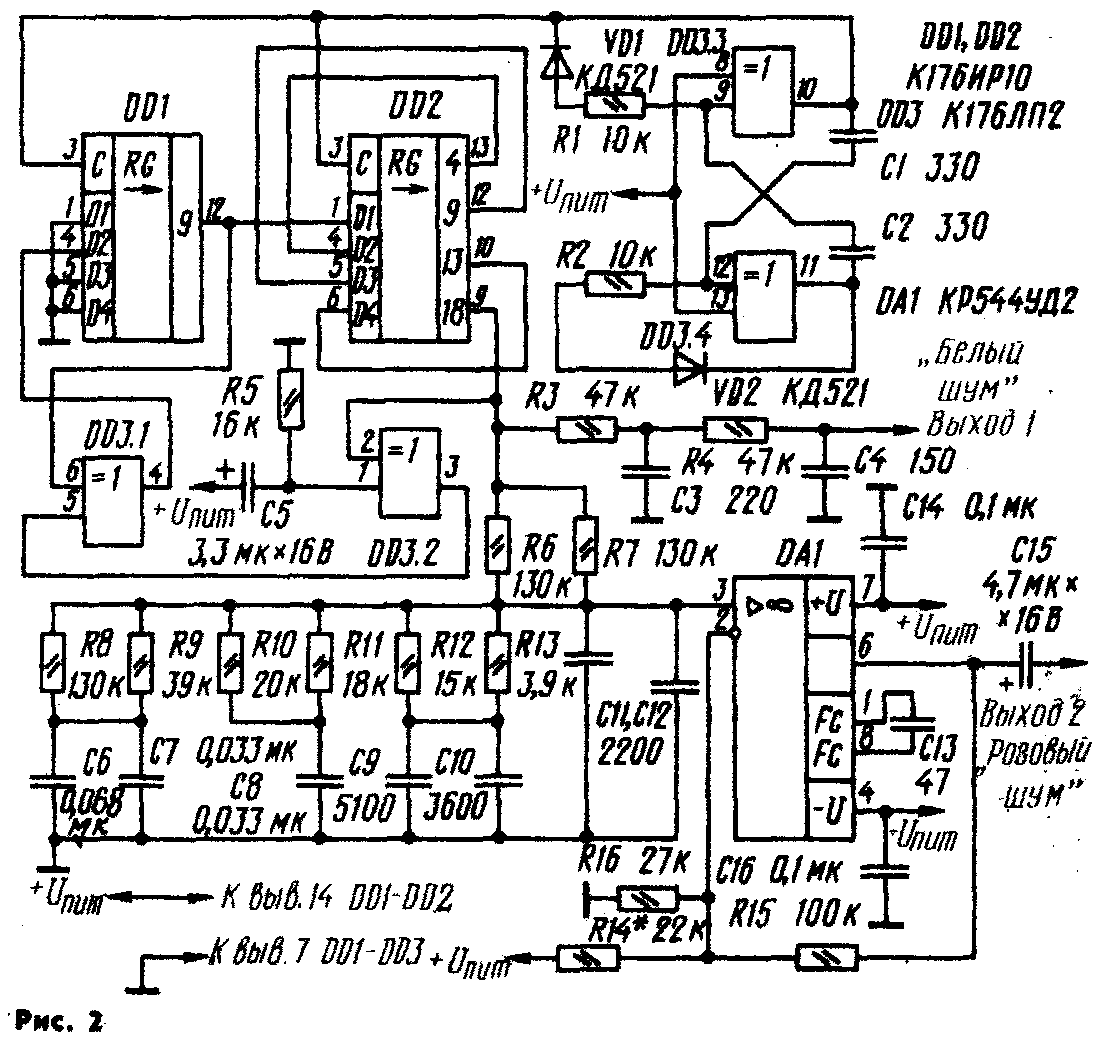 Полная принципиальная схема генератора шума приведена на рис. 2. Регистр сдвига выполнен на микросхемах DD1 и DD2 и содержит 23 разряда. Обратная связь реализуется через сумматор по модулю 2 (элемент «исключающее ИЛИ») на элементе DD3.1 микросхемы DD3. Ее сигнал вводится с 18-го разряда регистра на его вход вместе с выходной последовательностью. Цепь запуска выполнена на элементах R5 и С5. При включении питания на резисторе R5 образуется скачок напряжения — уровень логической единицы, который выводит регистр из нулевого состояния. Элемент «исключающее ИЛИ» при нулевом потенциале одного из его входов является повторителем логического состояния другого входа. Следовательно, если при включении питания все разряды регистра будут находиться в нулевом состоянии, то элементы DD3.1 и DD3.2 повторяют уровень логической единицы, сформированный на резисторе R5. Тогда в первые разряды регистра будет записана логическая единица. После заряда конденсатора С5 на резисторе R5 устанавливается нулевой потенциал и элемент DD3.2 станет повторителем логического состояния выхода регистра и влиять на работу формирователя не будет. При поступлении на один из входов элемента «исключающее ИЛИ» логической единицы этот элемент станет инвертором логического состояния второго входа. Это свойство использовано для построения тактового генератора на элементах DD3.3 и DD3.4. В остальном схема тактового генератора типовая. Фильтр «белого» шума выполнен на элементах R3, R4, СЗ и С4, представляет собой двухзвенный пассивный ФНЧ. В анализаторе спектра, где использован описываемый генератор шума, применяется «розовый» шум, а выход «белого» шума служит лишь для контроля генератора и поэтому не снабжен дополнительным буферным усилителем. Фильтр «розового» шума содержит четыре аппроксимирующих звена: R8, R9, С6, С7, RIO, R11, С8; R12, R13, С9, СЮ и СП. С12, образующих совместно с резисторами R6, R7 ФНЧ с АЧХ, спадающей при увеличении частоты с крутизной 3 дБ на октаву, что приводит к отображению истинной АЧХ исследуемого устройства. Параллельное соединение некоторых элементов позволяет обеспечить точную настройку АЧХ фильтра. Операционный усилитель DA1 на выходе фильтра уменьшает выходное сопротивление генератора и компенсирует уменьшение мощности шума в пассивном фильтре. Резистор R14 компенсирует постоянную составляющую М-последова-тельности, равную приблизительно половине напряжения, питающего цифровую часть генератора (Uпит). При указанных на схеме номиналах элементов погрешность аппроксимации АЧХ не превышает 0,5 дБ относительно кривой 3 дБ на октаву. Мощность «белого» шума составляет 970 мВ2, «розового» — 900 мВ2 (при Uпит = ±6 В). При таком напряжении питания генератор потребляет ток от обоих источников около 5 мА. Свои характеристики генератор сохраняет при изменении напряжения питания от ±5 до ±15 В.