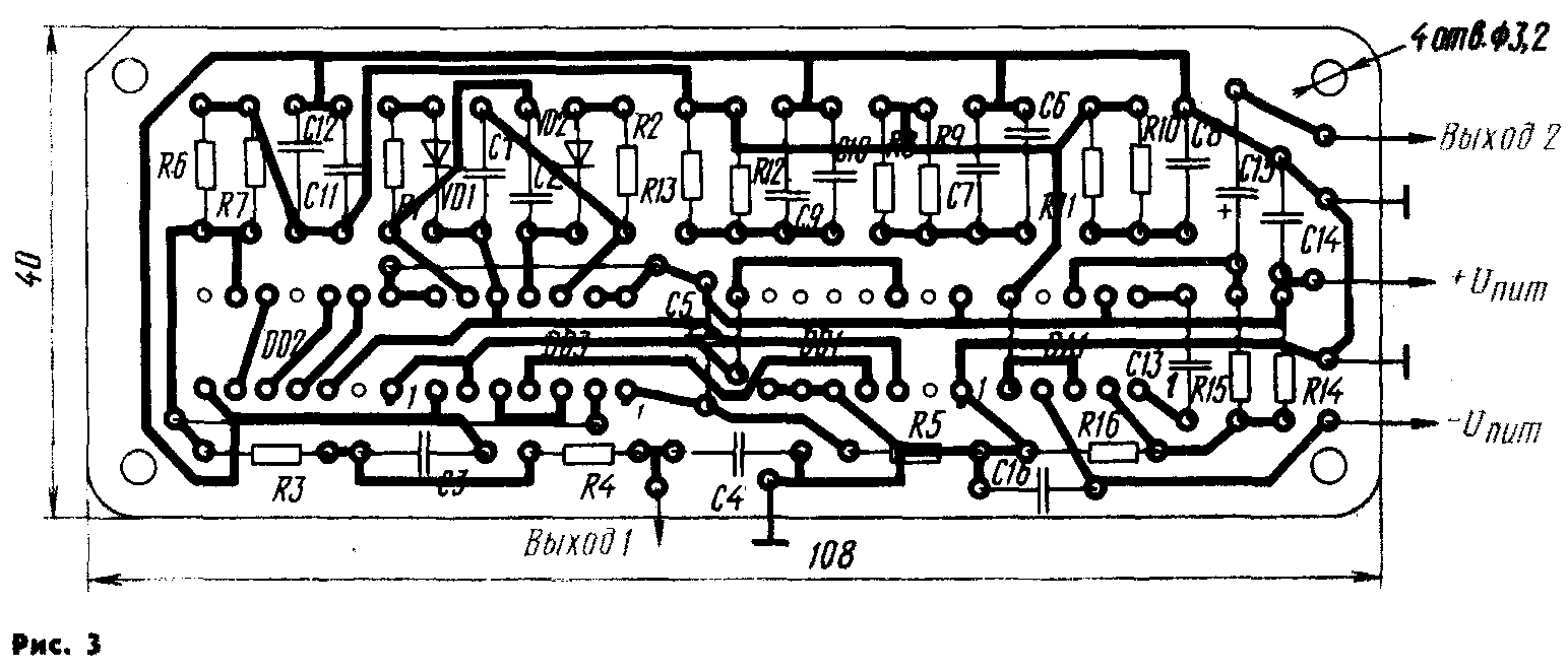 Генератор шума смонтирован на печатной плате из стеклотектолита толщиной 2 мм (рис. 3). В нем применены резисторы МЛТ-0,125 (можно МЛТ-0,25) с допустимым отклонением сопротивления от номинального значения + 5 %, конденсаторы — КМ-6Б или К53-1, К53-4 и т. п. (С5, CIS) и КМ4, КМ5 и КМ6 (остальные). Микросхему К176ЛП2 (ДДЗ) можно заменить К561ЛП2, а КР544УД2 — К544УД2, К140УД6 и К140УД8. Вместо диодов КД521 можно поставить КД522, КД503 и КД509. Следует иметь в виду, что при использовании ОУ К544УД2 и КР544УД2 вместо конденсатора С13 может быть установлена перемычка, а при использовании ОУ К140УД6 и К140УД8 этот конденсатор вообще удаляют. При отсутствии ошибок в печатной плате и монтаже генератор начинает работать без специальной настройки. Необходимо лишь проверить соответствие частоты тактового генератора требуемой и подогнать ее значение с помощью резисторов R1, R2 или конденсаторов С1, С2. Далее резистором R14 следует добиться компенсации постоянной составляющей М-последователь-ности. При полной ее компенсации сигнал на выходе ОУ DA1 (вывод 6) должен быть симметричен относительно нулевого уровня, что можно наблюдать с помощью осциллографа или вольтметра постоянного напряжения. При необходимости контроля АЧХ фильтра «розового» шума надо отпаять резисторы R6 и R7 от выхода генератора М-последо-вательности и, подключив к их свободным выводам генератор синусоидального низкочастотного напряжения, снять АЧХ, измеряя напряжение на выходе ОУ DA1.