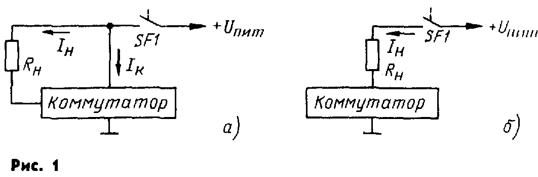 В журнале «Радио» неоднократно были опубликованы описания электронных коммутаторов различной степени сложности и назначения. Но у них всех есть одна общая черта, скорее — недостаток. Он заключается в том, что коммутатор с нагрузкой подключены к источнику питания параллельно, из-за чего общее число проводников в цепях питания коммутатора и нагрузки — не менее трех. Сказанное поясняет функциональная схема на рис. 1, а. Здесь SР1 — выключатель питания (для случая стоп-сигнальных фонарей механически связанный с педалью тормоза); Rн — нагрузка (лампы накаливания); Iк — ток коммутатора; Iн — ток нагрузки. Недостаток такого устройства очевиден.