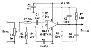 На рис.1 приведена схема предварительного усилителя ЦМУ. На вход усилителя можно подавать сигнал непосредственно с линейного выхода любого звуковоспроизводящего устройства. Резистором R1 осуществляют подстройку уровня входного сигнала. Усилитель собран на микросхеме К548УН1А (используется только одна половина микросхемы, имеющей в своем составе два канала УНЧ). Резистор R5 предназначен для коррекции обратной связи усилителя.