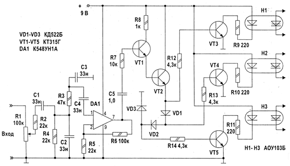 На рис.2 приведена схема одного из частотных фильтров ЦМУ — фильтра низкой частоты. Цепочка R2, Cl, С2, R3, R4, С3, С4 обеспечивает выборку низкочастотной составляющей звукового сигнала. Резистором R1 регулируют уровень входного сигнала для данного канала. Выбранный сигнал усиливается ОУ и поступает через цепочку С5, R7 на эмиттерный повторитель на транзисторах VT1, VT2. Далее сигнал преобразуется трехкаскад-ным пороговым усилителем на VT3, VT4. VT5. Нагрузкой коллекторов транзисторов VT3, VT4. VT5 являются тиристорные оптроны HI, Н2, НЗ. Роль пороговых элементов выполняют диоды VD1, VD2, VD3. Выходы оптронов подключены ко входам узлов фазоимпуль-сного управления. Применение оптронов обеспечивает гальваническую развязку силовой части ЦМУ и схемы управления.