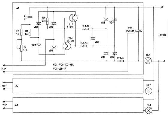 На рис.3 представлена схема фазоимпульсных узлов управления излучателями. Для каждого канала применяется три идентичных узла управления. Симисторы VS1, VS2, VS3 управляются сигналами с оптронов, они коммутируют лампы HL1, HL2, HL3, светимость которых изменяется путем фазоимпульсного управления. В узле управления используются диоды VD6-VD9, образующие выпрямительный мост, напряжение которого стабилизировано стабилитроном VD5. Пульсирующее напряжение через R5, R6 поступает на транзисторы VT1, VT2. В каждом полупериоде сетевого напряжения транзисторы VT1, VT2 открываются при зарядке С1 до напряжения, равного напряжению, поступающему на базу VT1. Время открытия VT1 регулируется резистором R3. Каждый из трех каналов ЦМУ включает: фильтр с тремя оптронными управляющими каскадами, три блока управления А1, А2, A3, которые идентичны для всех каналов. В схемах фильтров для каналов СЧ и ВЧ конденсаторы С1 - С4 должны иметь емкости: 6800 пФ - для СЧ, 1500 пФ - для ВЧ.