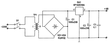 Схема управления потребляет ток порядка 500 мА. Источник питания 9 В может быть любой конструкции, например, показанный на рис.4. Параметры ТР1: мощность - 8...10 Вт, выходное напряжение - 10... 13 В. Стабилизатор выполнен на микросхеме КР142ЕН8А с напряжением стабилизации 9В. Микросхему необходимо установить на теплоотводящий радиатор.