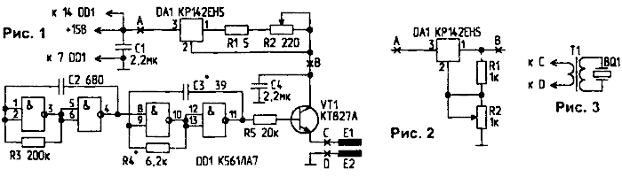 УЗСУ состоит из источника питания (микросхема DA1), двух взаимосвязанных генераторов, работающих на частотах 10 кГц и 1 МГц (микросхема DD1), выходного каскада на транзисторе VT1 и активатора-излучателя, подключаемого к точкам С и D устройства. Источник питания в прототипе выполнен нерегулируемым, рассчитанным на максимальную мощность, потребляемую от сети - 3 Вт, что достаточно для стирки белья в объеме жидкости 10...25 литров. Более целесообразным представляется обеспечить УЗСУ плавной регулировкой выходной мощности. На рис.1 в разрыв между точками А и В включен регулируемый источник стабилизированного постоянного тока (25...1000 мА). На рис.2 показана схема регулируемого источника питания (5...13 В). Генератор пакетов импульсов выполнен по традиционной схеме на микросхеме DD1 и особенностей не имеет. Номиналы RC-элементов высокочастотной части генератора могут быть откорректированы при настройке частоты в резонанс с частотой ультразвукового излучателя-активатора. Микросхема DA1 и транзистор VT1 должны быть установлены на теплоотводящих пластинах.