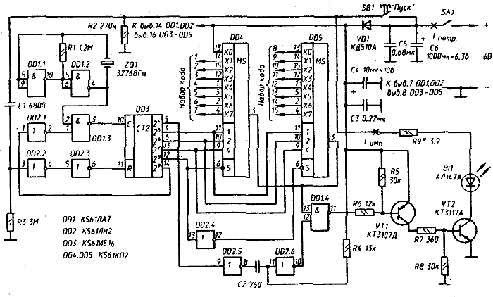 На рис. 1 приведена принципиальная схема генератора, формирующего подобным образом последовательность инфракрасных вспышек. Здесь DD1.1, DD1.2, Rl, ZQ1 - задающий генератор, работающий на частоте часового кварцевого резонатора ZQ1 - 32768 Гц. Микросхемы DD4 и DD5 составляют электронный коммутатор, его выход (объединенные выводы 3 DD4 и DD5) оказывается соединенным с одним из Х-входов этих микросхем в зависимости от адреса, поступающего на входы 1, 2, 4, и сигнала на входе S (активизируется микросхема с S=0). Адрес и сигнал S формирует счетчик DD3. Легко вычислить, что смена адреса будет происходить здесь каждые 0,976 мс (25/32768 с), это tзн - длительность знакоместа в кодовой посылке. В середине каждого знакоместа может быть сформирован короткий (R4C2=~10 мкс) импульс на выходе DD1.4. Но это произойдет лишь в том случае, если данному знакоместу будет соответствовать сигнал лог. 1 на выходе коммутатора. Этот импульс откроет нормально запертый транзисторный усилитель (VT1, VT2 и др.) и ток, возникший в ИК диоде BI1, преобразуется в ИК вспышку той же длительности.