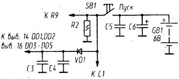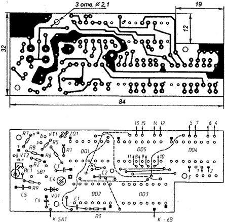 Но в таком случае кнопку SB1 потребуется нажимать дважды: первое нажатие даст, скорее всего, неверную комбинацию (которая, кстати, может быть даже полезна как маскирующая истинный код). Без выключателя SA1 можно обойтись и в том случае, если в качестве источника питания генератора будет взята низковольтная батарея достаточной емкости, способная обеспечить продолжительную его работу при постоянно включенных микросхемах. Например, литиевый элемент с ЭДС=3 В, имеющий электрическую емкость 0,1 А.ч, сможет проработать в таком режиме около года. В кодовом излучателе могут быть использованы практически любые И К диоды, ограничения - лишь габаритные: высота деталей на печатной плате не должна превышать 8 мм. Все резисторы здесь -типа МЛТ-0,125, неэлектролитические конденсаторы - КМ-5, КМ-6, К10-17Б и др. Конденсатор С4 - типа K50-35 или К50-40. Рабочее напряжение копденсатора С6 (CE-DS Магсоn, его монтируют в положении «лежа») должно соответствовать напряжению источника питания. В варианте, показанном на рис. 4, необходимо предварительно проконтролировать состояние его диэлектрика: ток утечки в С6 должен быть меньше 1 мкА. При увеличении сопротивления резистора R9, ограничивающего ток в ИК диоде, емкость конденсатора С6 может быть соответственно уменьшена. Довольно большая «дальнобойность» ИК излучателя (с R9=3,9 Ом превышающая 10 м) может оказаться просто ненужной.