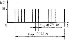 Фольгу со стороны деталей используют лишь в качестве общего провода (с ней соединен «-» источника питания): в местах пропуска проводников она должна иметь выборки - кружки диаметром 1,5...2 мм (на рисунке не показаны). Места соединения с нуль-фольгой «заземляемых» выводов резисторов, конденсаторов и др. показаны черными квадратами; черными квадратами со светлой точкой в центре - «заземляемые» выводы микросхем и положение проволочной перемычки, соединяющей с нуль-фольгой «минусовой» вывод конденсатора С4. В качестве источника питания генератора можно взять 6-вольтную батарею 11А (габариты - 10,3х16 мм, электрическая емкость -33 мА.ч). Выключатель SA1 типа ПД9-1 монтируют непосредственно на корпусе генератора. Кнопка SB1, типа ПКн-159 или подобная ей, должна иметь провод длиной 6...8 мм, достаточный для его вывода сквозь стенку корпуса. Правильно собранный генератор наладки не требует. Проконтролировать его работу можно с помощью осциллографа, подключив его вход к коллектору транзистора VT1. После включения SA1 и нажатия кнопки SB1 на экране осциллографа (время ждущей развертки 20...30 мс) должна возникнуть и исчезнуть последовательность импульсов, расставленных во времени в соответствии с закоммутированным сигналом. Если это рассмотренный выше код 111011100111001, то ему будет соответствовать осциллограмма, изображенная на рис. 3.