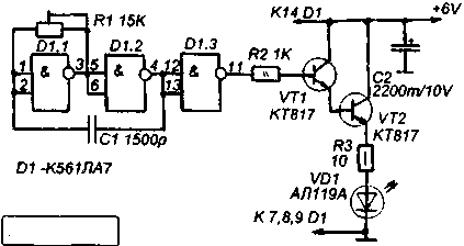 Принципиальная схема ИК-передатчика показана на рисунке 1. Основу передатчика составляет генератор прямоугольных импульсов на микросхеме D1. Выходной сигнал генератора с частотой 35 кГц поступает на базу транзистора VT1, который совместно с VT2 образует составной транзистор Дарлингтона. При помощи этого транзистора коммутируется ИК-светодиод VD1. Отраженный сигнал поступает на вход приемника, схема которого показана на рисунке 2.