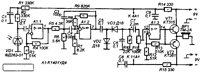 Налаживание правильно собранной схемы сводится к подстройке частоты передатчика резистором R1 до получения на выходе приемника максимальной амплитуды сигнала. ОУ К1401УД4 не имеет прямой замены среди отечественных микросхем, но вместо А1.1 и А1.2 можно применить любые ОУ с полевыми транзисторами на входе и частотой единичного усиления не менее 2,5 МГц. А1.3 можно заменить на любой ОУ широкого применения. Автор проверял такой вариант : КР574УД2Б и К140УД708. Заметно повысить характеристики приемника можно если применить малошумящие ОУ TLE2074CN и TLE2144CN фирмы Texas Instruments. Цоколевка этих микросхем полностью совпадает с цоколевкой К1401УД4. Светодиод и фотодиод можно взять зарубежного производства для систем ДУ. В авторском варианте схема с К1401УД4 обеспечивала уверенный съем информации с расстояния 5-10 метров, вариант с TLE2074CN обеспечивал съем информации с расстояния до 15-20 метров, кроме того этот вариант в силу более низкого уровня шумов позволял уверенно разбирать тихие слова даже на фоне громкой музыки. Чувствительность устройства можно повысить дополнительными ИК-светодиодами, включенными параллельно VD1 передатчика (через свои ограничительные резисторы). Можно также увеличить коэффициент усиления приемника добавив каскад, аналогичный каскаду на А1.2, для этого можно использовать свободный ОУ микросхемы А1. Конструктивно светодиод и фотодиод расположены так, чтобы исключить прямое попадание ИК-излучения светодиода на фотодиод, но уверенно принимать отраженное излучение. Не исключено применение оптических систем, например таких как в Л.2. Питание приемника осуществляется от двух батареек типа "Крона", передатчик питается от четырех элементов типа R20 суммарным напряжением 6В (1,5В каждый). В заключение следует напомнить, что использование этого устройства в некоторых случаях запрещено законодательством РФ и может привести к административной или уголовной ответственности.