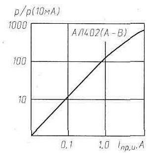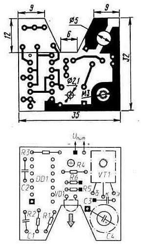 Печатную плату генератора изготавливают из двустороннего фольгированного стеклотекстолита толщиной 1...1,5 мм (рис. 2). Фольгу со стороны деталей используют лишь в качестве нулевого провода-«земли». В местах пропуска проводников в ней должны быть вытравлены кружки диаметром 1,5...2 мм (на рисунке не показаны), места пайки к нуль-фольге «заземляемых» выводов конденсаторов, резисторов и др. показаны зачерненными квадратами. В качестве примера на рис. 3 приведена зависимость относительной мощности излучения ИК диода АЛ402 от прямого импульсного тока Iпр.и. Почти линейная их связь и при столь значительном форсаже импульсных токов, которая вообще характерна для ИК диодов, позволяет ориентироваться при расчетах «дальнобойности» системы не на мощность излучения, а на легко контролируемый ток в ИК диоде.