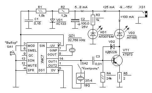 Ядро схемы передатчика микросхема DD1 синтезатора мелодий УМС7. Питание DD1 3V стабилизированное, снимается через фильтр C1, R1 со стабилитрона VD1 параметрического стабилизатора R2, VD1. Включение питания устройства индицирует светодиод HD1. Работоспособность синтезатора и текущая мелодия оценивается на слух по звуку c пьезоизлучателя BQ при включении тумблера SA2 "Контроль". Нажатие на кнопку SA1 "Выбор", меняет по кольцу воспроизводимые мелодии. Выходной сигнал с контакта 14 DD1 подаётся на формирователь коротких подсвечивающих импульсов, состоящий из дифференцирующей цепочки C3, R4 и диода VD2 , защищающего базу транзистора VT1 от импульсов обратной полярности. На супербета транзисторе VT1 собран импульсный генератор импульсов стабильного тока через ИК эмиссионный диод VD3, не зависящих от величины питающего напряжения. Величина тока в импульсе задаётся выбором номинала резистора R5. Средний ток зависит, как от значения тока в импульсе, так и от среднего количества импульсов в единицу времени, определяемого конкретной мелодией.