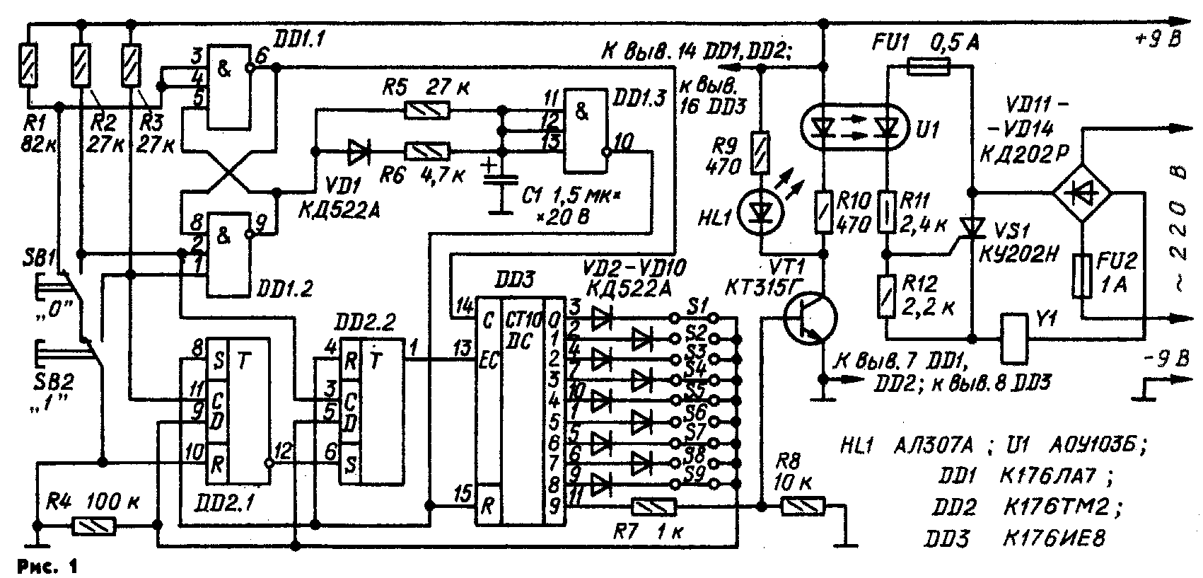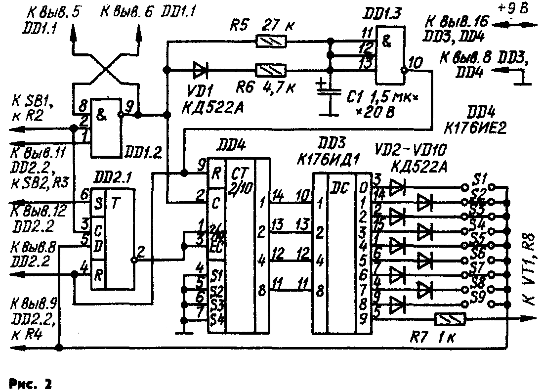 В блоке применены постоянные резисторы МЛТ, конденсатор — К53-4А. Микросхему К176ИЕ8 можно заменить узлом из двух микросхем — К176ИЕ2 и К176ИД1, собранным по схеме на рис. 2.