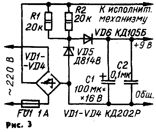 Сообщаем одновременно, что в исполнительном устройстве можно использовать электромагнит от лентопротяжного механизма магнитолы «Романтика-106». Его высокоомную обмотку (35 Ом) включают последовательно с балластным резистором, сопротивление которого должно быть таким, чтобы ток через обмотку был равен 0,4 А. Подойдет также электромагнит от магнитофона «Комета-201».