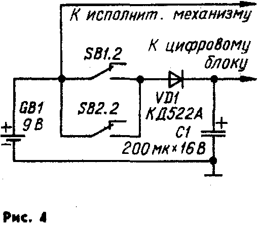 При работе замка в стационарных условиях его удобно питать от сетевого блока без понижающего трансформатора (рис. 3) В этом случае все цепи устройства находятся под напряжением сети. Поэтому при эксплуатаиии замка необходимо соблюдать меры предосторожности, а при проверке и ремонте электронного блока использовать автономный источник питания. При использовании замка на переносном объекте в качестве источника питания применяют батарею «Корунд». Энергоресурс замка можно повысить, если питание на него подавать только в момент набора кода. Фрагмент схемы узла, реализующего эту функцию, показан на рис. 4. В этом варианте кнопочные переключатели SB1 и SB2 должны быть каждый с двумя группами переключающих контактов. Группы SB1.2 и SB2.2 служат для коммутации напряжения питания при наборе кода. Время существования напряжения питания цифрового блока определяет емкость конденсатора С1, оно должно быть примерно в два раза больше установленной выдержки времени.