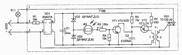 При работе схемы автомата в режиме освещения, лампа EL1 будет светиться вполнакала, так как она работает на одной полуволне сетевого напряжения, но этого вполне достаточно для освещения, а увеличить яркость можно, увеличив мощность лампочки. При желании схему легко дополнить еще одной кнопкой — SB3 (включенной параллельно с кнопкой SB2), которая будет связана с дверью и при ее открывании включит свет. Устройство может найти и другие применения, например для включения света в подвале. В этом случае кнопка SB1 и звонок не нужны, а время работы освещения можно увеличить, применив конденсатор С1 большей емкости (в схеме применен конденсатор типа К50-29 на 300 В) или подобрав резистор R2. Для стабильной работы схемы ток утечки у конденсатора должен быть минимальным. В качестве кнопки SB2 удобно использовать любой двухсекционный включатель света, доработав одну секцию для использования ее в качестве кнопки. Для этого под подвижный контакт подкладывается пористая резина, которая не позволит одной секции включателя находиться в фиксированном состоянии после нажатия на нее. Имеющуюся кнопку звонка можно доработать, дополнив ее еще одним контактом, но если у вас есть реле с рабочим напряжением 220 В можно обойтись одной группой контактов. При этом реле включается параллельно со звонком и при его срабатывании своими контактами (работающими вместо второй группы контактов кнопки) разряжает С1. Данная схема имеет меньшие габариты, не содержит дефицитных деталей и проще в изготовлении и подключении. Иногда хочется иметь постоянную подсветку, например в коридоре. Подсветка не потребляет много энергии (7...15 Вт), но экономичней, если она будет работать только в темное время суток. Включать и выключать подсветку вручную не всегда удобно. Тем более что это успешно может выполнять автоматика. Электрическая схема автоматического включателя приведена ниже.