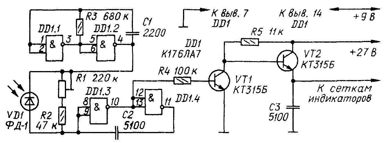 Устройство состоит из генератора прямоугольных импульсов на логических элементах DDI.l, DD1.2, узла регулирова ния с ква ж пости и мпул ьсов, собранного на элементах DD1.3, DD1.4 и цепи VD1 R1R2C2, усилителя импульсов на транзисторе VT1 и электронного ключа на транзисторе VT2. Частота повторения импульсов генератора - 400 Гц, длительность импульсов 1,5 мс. Узел регулировки скважности задерживает фронт импульсов генератора в зависимости от освещенности фотодиода VD1. Чем она больше, тем меньше время задержки фронта импульсов, причем частота их остается неизменной. Положение спада импульсов остается неизменным. Импульсы с изменяющейся скважностью усиливает транзистор VT1. Электронный ключ VT2 коммутирует напряжение на сетках индикаторов. Коллекторная цепь транзисторов подключена к источнику напряжения питания индикаторов.