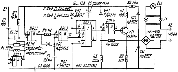 Триггеры Шмитта DD1.1-DD1.3 микросхемы К561ТЛ1 и D-триггер DD2.1 микросхемы K561TM2, работающий в счетном режиме, образуют цифровую часть устройства, а четвертый триггер Шмитта DD1.4 той же микросхемы DD1, P-N-P транзистор VT1 и тринистор VS1 - узел управления лампой накаливания EL1, включаемой (через разъем X1) в диагональ выпрямительного моста VD5-VD8. С выхода выпрямителя пульсирующее сетевое напряжение выпрямителя подается непосредственно на тринистор VS1, через делитель R6R5 - на входной вывод 5 триггера DD1.4, и к стабилизатору напряжения R8VD2, являющемуся источником питания микросхем и транзистора. Оксидный конденсатор C5 сглаживает пульсации стабилизированного напряжения.