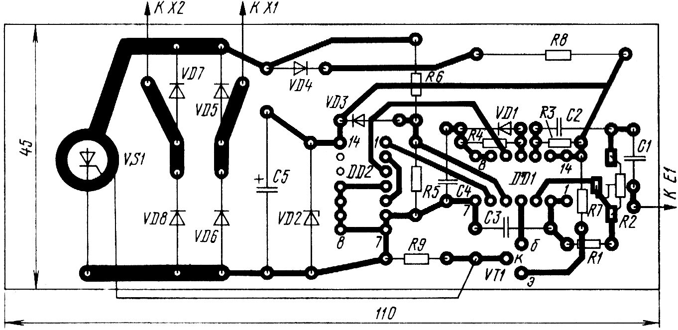 Все его детали, кроме сенсорного контакта, монтируют на печатной плате из фольгированного материала (рис.2). Транзистор VT1 может быть любым из серий КТ361, КТ208, КТ209, КТ502, КТ3107. Тринистор VS1 - КУ202К - КУ202Н, КУ201К, КУ201Л. Диод VD1 - любой детекторный или импульсный, VD3 и VD4 - любые выпрямительные. Диоды VD5-VD8 заменимы на выпрямительный мост КЦ401Б, КЦ402А - КЦ402В, КЦ405А - КЦ402Б. Стабилитрон VD2 должен быть на напряжение стабилизации 10...14 В - Д814В-Д814Д, КС210Ж - КС213Ж, КС210Б, КС210Е, КС510А. Конденсатор C5 - оксидный К50-24, другие - КТ, КД (C1-CЗ) и КЛС, КМ (C4). Резистор R2 - СПЗ-3, остальные - ВС, МЛТ. В целях безопасности конденсатор C1 должен быть на номинальное напряжение не менее 250 В. Сенсорный элемент - это металлическая фольга площадью 40...50 см?, помещенная между двумя пластинками тонкого текстолита, органического стекла. Можно также использовать пластину одностороннего фольгированного материала и наклеить на ее фольгированную сторону пластину из диэлектрика. Фольга такого сенсора должна быть удалена по всему периметру. С платой сенсор соединяйте проводом в надежной изоляции минимальной длины.