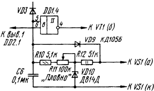 А теперь - коротко об экономичности управления тринистором. При переходе сетевого напряжения через нуль тринистор закрывается. Открывается же тринистор, когда значение пульсирующего напряжения на нем становится равным примерно, 20 В, а напряжение на входном выводе 5 триггера DD1.4 достигает высокого уровня. В это время на выходе триггера появляется сигнал низкого уровня, транзистор открывается и в цепи управляющего электрода тринистора возникает импульс тока. Как только тринистор откроется, напряжение на нем скачком уменьшится до 1,5...2 В, а на выводе 5 триггера DD1.4 - до низкого уровня. В результате на выводе 4 триггера появляется сигнал высокого уровня и транзистор закрывается. Таким образом транзистор открывается лишь на время, равное времени срабатывания тринистора, то есть всего на несколько микросекунд. Соответственно тринистор за полупериод сетевого напряжения управляется одним очень коротким импульсом тока, что и повышает экономичность описываемого устройства.