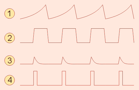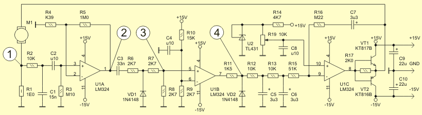 Для получения сигнала обратной связи в цепь питания двигателя включен датчик тока R1 (рис. 1). Ток, потребляемый двигателем, создает на этом резисторе падение, которое имеет переменную составляющую около 100 мВ peak-to-peak (рис.2, график 1). Основная гармоника выделяется с помощью простейшего ФНЧ R2C1 и через разделительный конденсатор C2 поступает на вход усилителя, собранного на ОУ U1A. Коэффициент усиления задан резисторами R4R5 так, чтобы усилитель работал в режиме ограничения. На его выходе формируетя практически прямоугольный сигнал с частотой, равной утроенной частоте вращения двигателя (рис. 2, график 2). Этот сигнал дифференцируется с помощью цепочки C3R6R7R8 (рис. 2, график 3). Отрицательный выброс ограничивается диодом VD1. Далее сигнал поступает на компаратор, в роли которого использован ОУ U1B. Опорное напряжение задается с помощью делителя R9R10. На выходе компаратора формируются прямоугольные импульсы постоянной длительности (рис. 2, график 4). Постоянная составляющая такой импульсной последовательности пропорциональна частоте следования импульсов, т.е. частоте вращения двигателя. Импульсная последовательность интегрируется с помощью цепочек R11R12C5 и R13C6. Постоянное напряжение, пропорциональное частоте вращения, поступает на пропорционально-интегрирующий регулятор, собранный на ОУ U1C. Для получения образцового напряжения применен регулируемый стабилитрон U2. Нужную частоту вращения устанавливают регулировкой этого напряжения с помощью переменного резистора R19. Выход ОУ U1C умощнен комплементарным эмиттерным повторителем на транзисторах VT1VT2. Казалось бы, направление тока питания двигателя всегда одно и то же и достаточно было бы одиночного эмитерного повторителя, который обеспечивал бы вытекающий ток. Но на самом деле с двухтактным эмиттерным повторителем гораздо лучше поведение системы во время переходных процессов (при пуске двигателя или при резких колебаниях нагрузки на валу) [2].