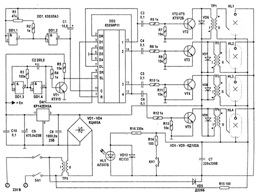 На элементах DD1.1, DD1.2 собран генератор стробирую-щих импульсов, которые подаются на соответствующий вход DD2. Частоту этого генератора можно плавно менять резистором R1. Второй генератор на элементах DD1.3. DD1.4 генерирует импульсы переключения для управления DD2 по входам SR и SL. Микросхема DD2 является сдвиговым регистром, а схема ее включения такова, что с приходом очередного тактового импульса происходит циклический (по кругу) сдвиг записанной в регистр информации. Направление сдвига задается комбинацией сигналов на входах SR и SL. Если на входе SR — логическая 1 а на входе SL — логический 0, то происходит сдвиг вправо, при противоположных сигналах на входах — сдвиг влево. Таким образом, лампы HL1, HL2, HL3, HL4, управляемые сигналами с выходов сдвигового регистра DD2, будут поочередно вспыхивать. Автоматическую смену направления вспышек осуществляет генератор на DD1.3, DD1.4. Транзистор VT1 служит для инверсии сигнала генератора. Импульсы управления от микросхемы DD2 поступают через емкости С3, С4, С5, С6 на транзисторные ключи VT2-VT5, которые управляют импульсными высоковольтными трансформаторами ТР1-ТР4. Микросхемы DD1, DD2 запитываются от стабилизированного источника питания +5 В на микросхеме КР142ЕН5А. На транзисторные ключи подается нестабилизированное напряжение +10 В. В коллекторные цепи ключевых транзисторов включены защитные диоды VD6-VD9. Накопительная емкость С7 заряжается от сети ~220 В через выпрямительный диод VD5 и токоограничивающий резистор R15. Кнопка КН1 служит для снятия остаточного заряда с емкости С7 после окончания работы со стробоскопом и при настройке. Свето-диод HL5 предназначен для контроля разрядки конденсатора С7. Трансформаторы ТР1-ТР4 изготавливаются самостоятельно. Они наматываются на ферритовых стержнях диаметром 3 мм и длиной около 15 мм из феррита марки 600НН. Обмотка I содержит 20 витков провода ПЭЛ-1 0.25. обмотка И содержит 800 витков провода ПЭЛ-1 0.07. Каждый слой обмотки тщательно изолируется конденсаторной бумагой. После изготовления трансформатор можно опустить в расплавленный парафин, что обеспечит дополнительную электроизоляцию и зафиксирует обмотки. Силовой трансформатор ТР5 также можно изготовить самостоятельно, но можно применять и любой готовый с мощностью не менее 6...8 Вт и выходным напряжением 8...12 В. В том случае, когда лампы монтируются в отдельных корпусах, управляющий поджигом импульсный трансформатор размещают непосредственно возле лампы. Длина кабеля, соединяющего блок лампы и трансформатора с управляющим блоком, не должна превышать 20 м. При изготовлении, настройке и эксплуатации прибора необходимо соблюдать меры предосторожности по работе с высоким напряжением.